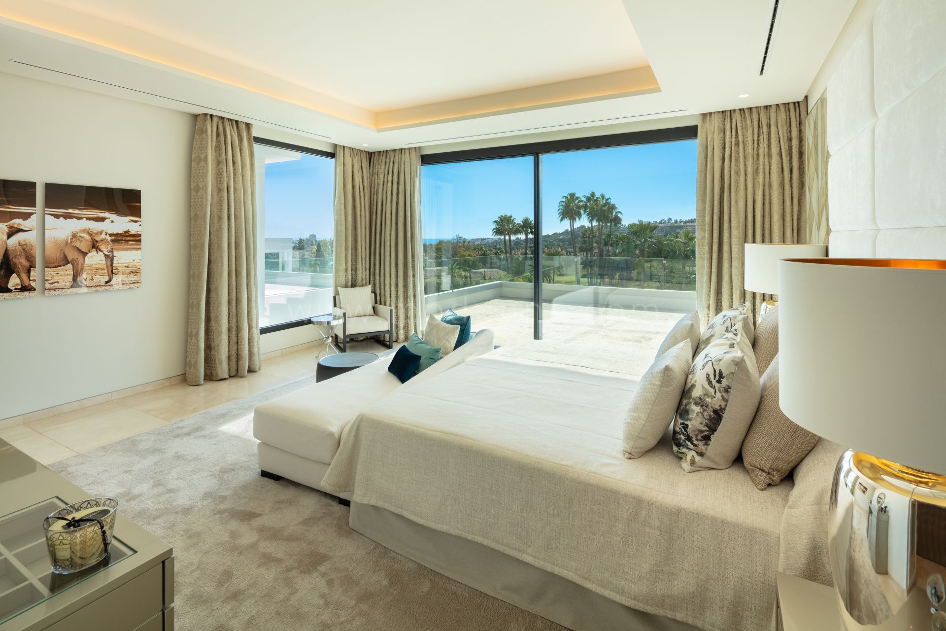 La propiedad cuenta con un estilo arquitectónico mediterráneo moderno, con interiores elegantes y con estilo diseñados con la última tecnología y materiales de alta calidad. Consta de seis amplios dormitorios, seis modernos cuartos de baño y dos aseos para invitados,