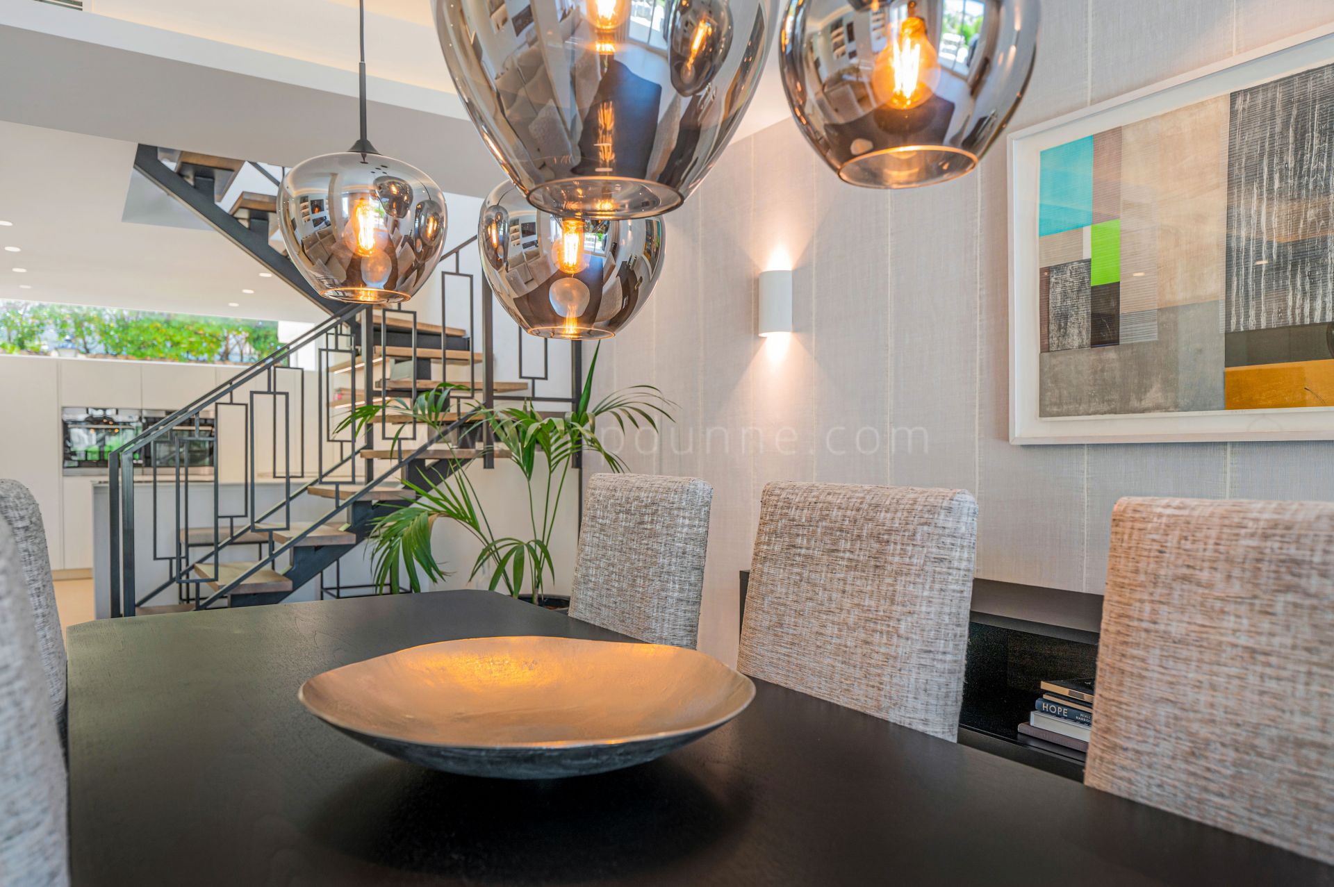 Distribuida en tres niveles, la planta baja alberga una luminosa y espaciosa zona de estar y comedor de concepto abierto. La cocina, hecha a medida, está equipada con electrodomésticos de alta gama, vinoteca y una elegante chimenea. Grandes puertas correderas de cristal se abren a una terraza privada con jardín paisajístico, ideal para comer al aire libre y disfrutar con invitados.