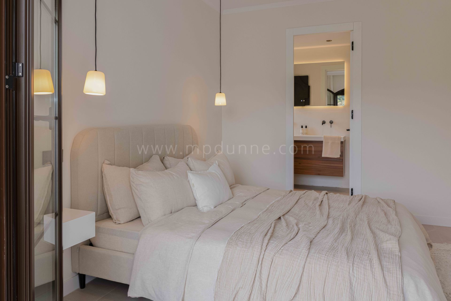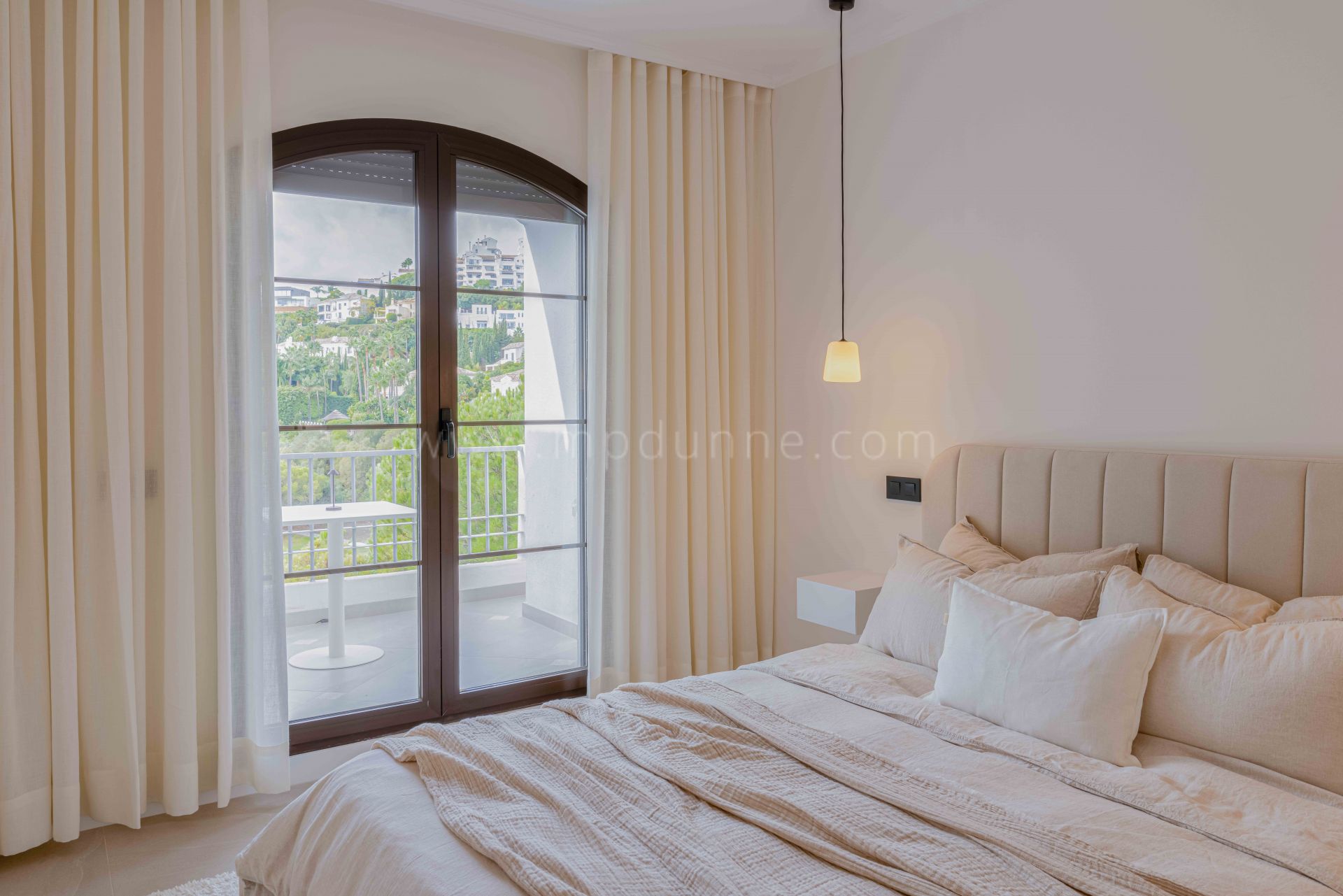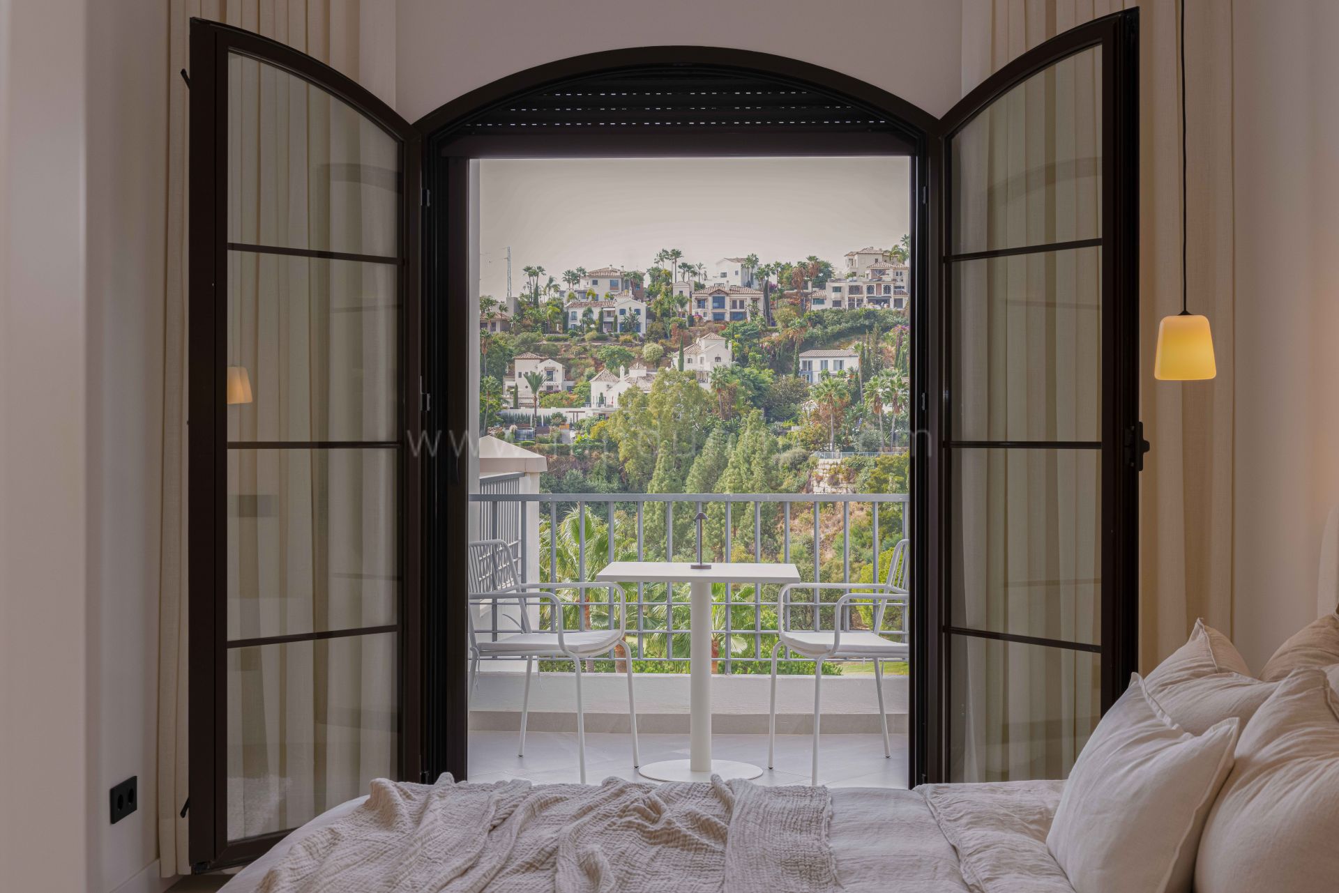 Las amplias puertas correderas conducen a una terraza encantadora desde donde se aprecian las vistas tranquilas de Los Arqueros. Cada rincón ha sido diseñado para equilibrar confort, luz y privacidad.
