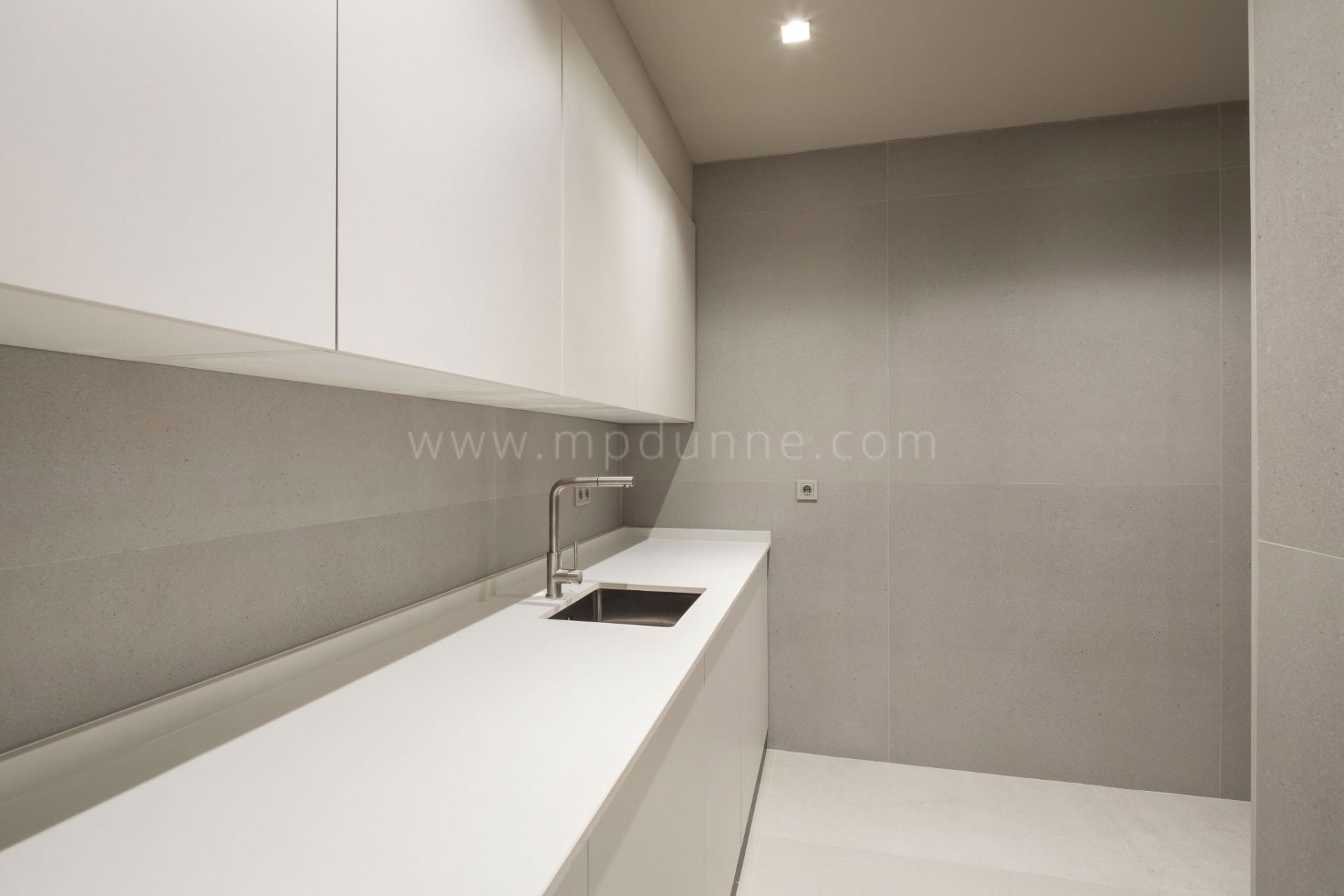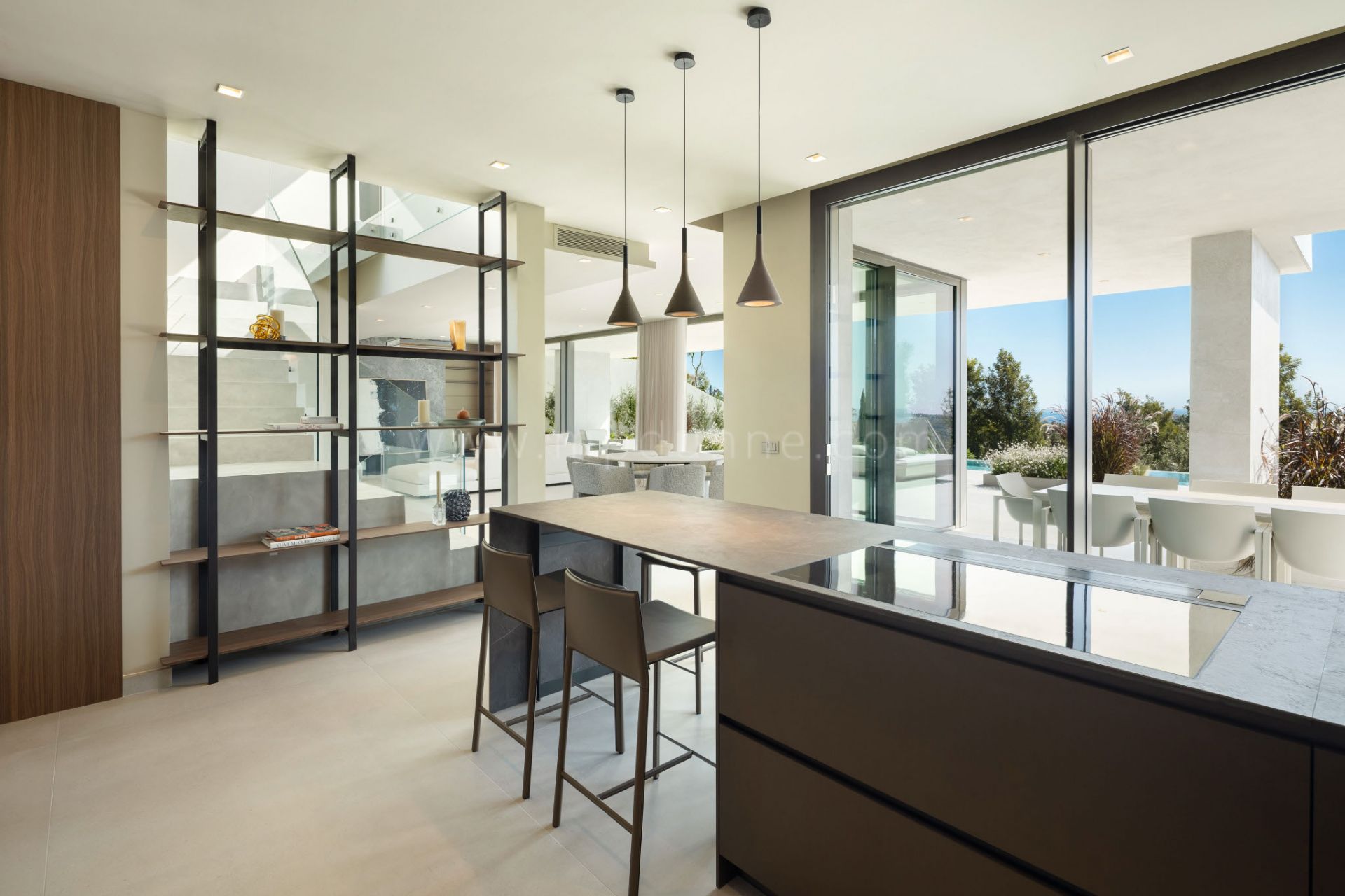 Los interiores ofrecen estancias generosas y bien proporcionadas, incluido un salón-comedor de planta abierta que se conecta con las zonas exteriores. La cocina de diseño con carpintería Modulnova aporta elegancia y comodidad, mientras que las ventanas de aluminio Schüco permiten que la luz llene cada rincón. La escalera de hormigón pulido con barandilla de cristal y los acabados contemporáneos completan una estética limpia y moderna.