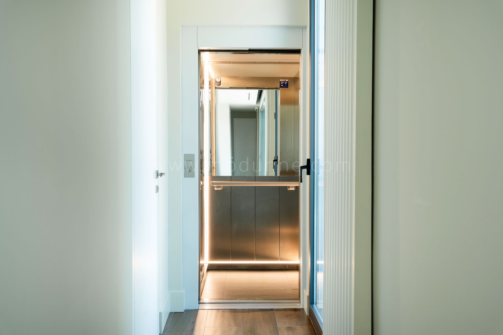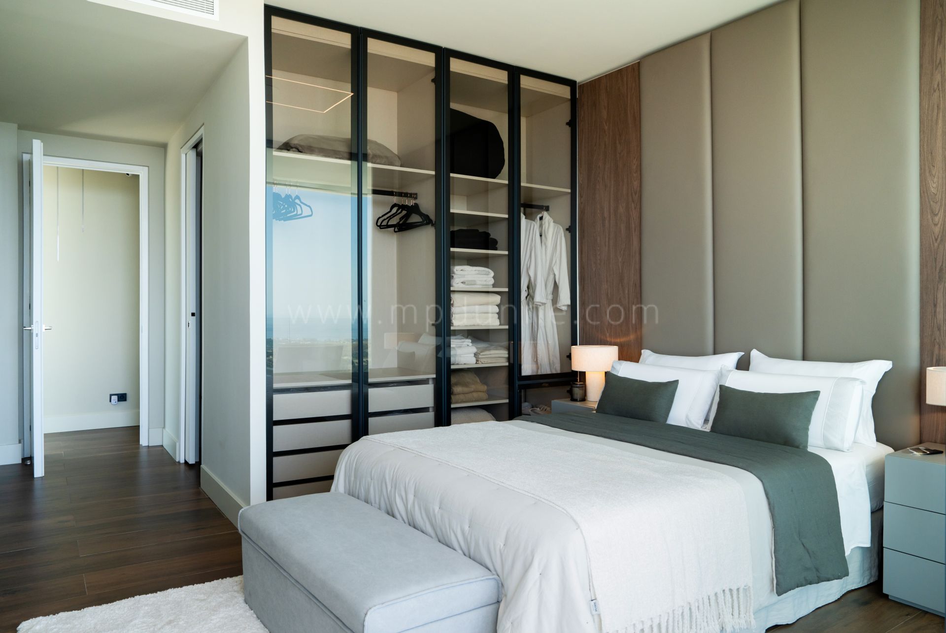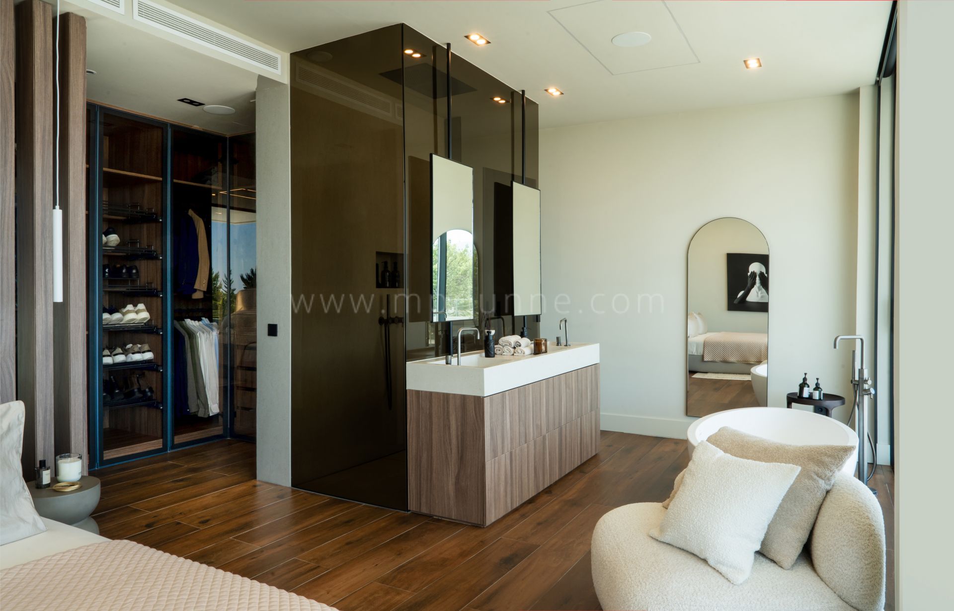 La villa cuenta con varios dormitorios con baños en suite, incluido el dormitorio principal con vistas al mar. También dispone de aseos para invitados, ascensor privado que conecta todas las plantas y un sistema domótico para mayor comodidad.