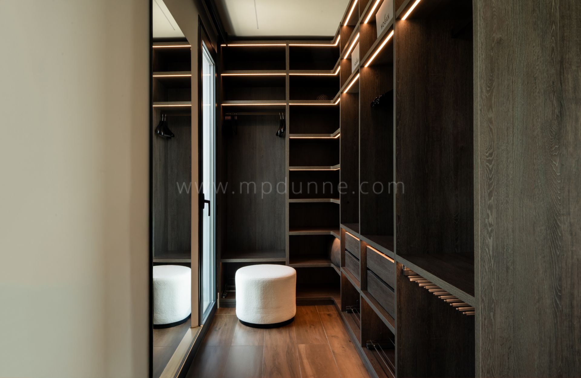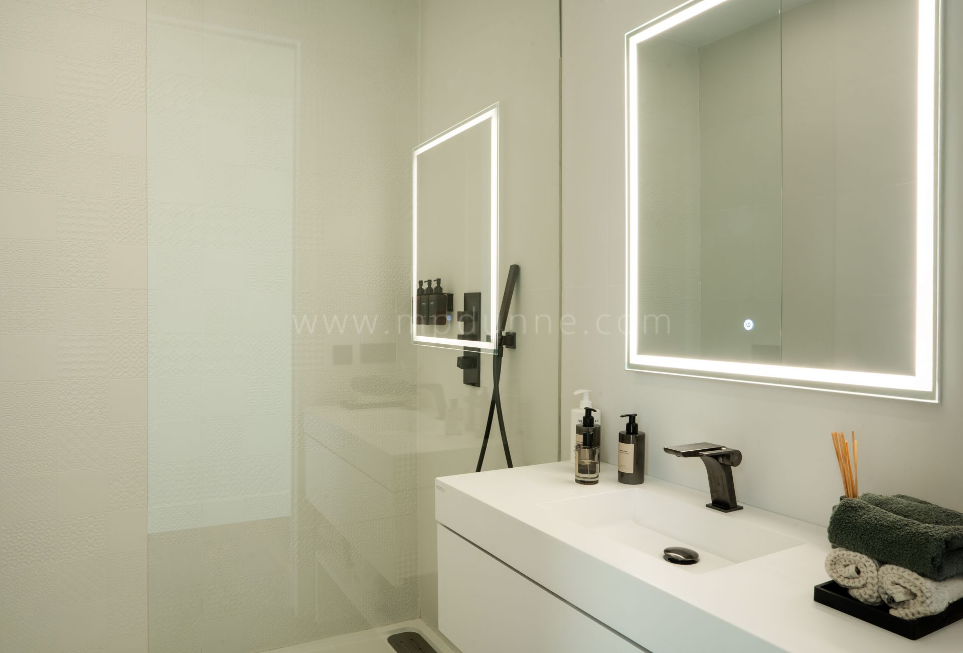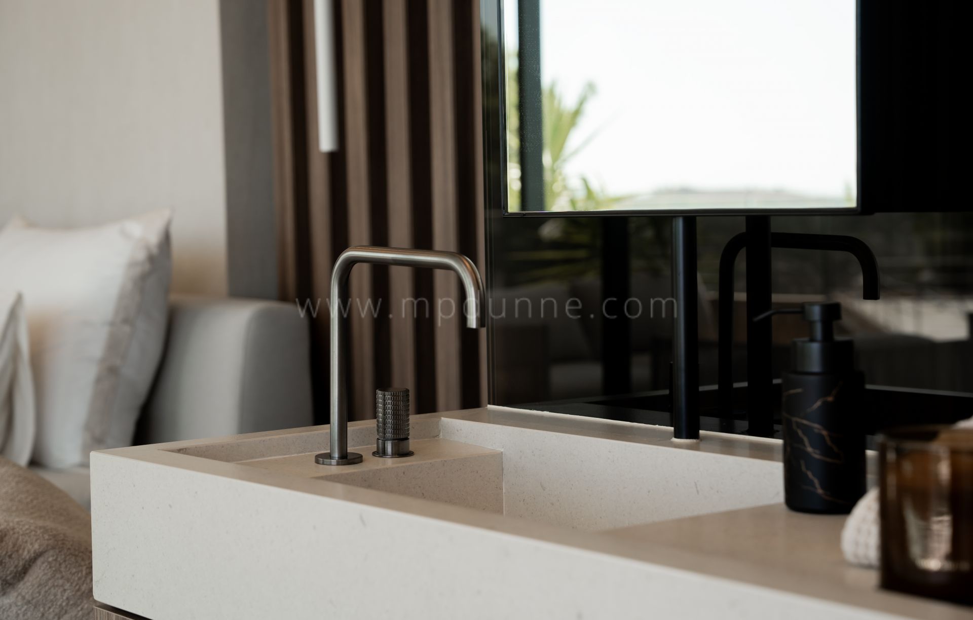 La villa cuenta con varios dormitorios con baños en suite, incluido el dormitorio principal con vistas al mar. También dispone de aseos para invitados, ascensor privado que conecta todas las plantas y un sistema domótico para mayor comodidad.