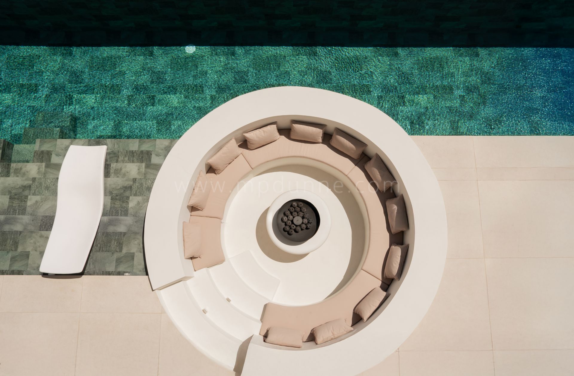 El diseño favorece una transición natural entre los espacios interiores y exteriores. Un salón hundido y un comedor llamativo se abren a terrazas y jardines, con abundante entrada de luz natural. La cocina y las zonas principales están bien conectadas con el exterior, lo que permite disfrutar del entorno durante todo el año.