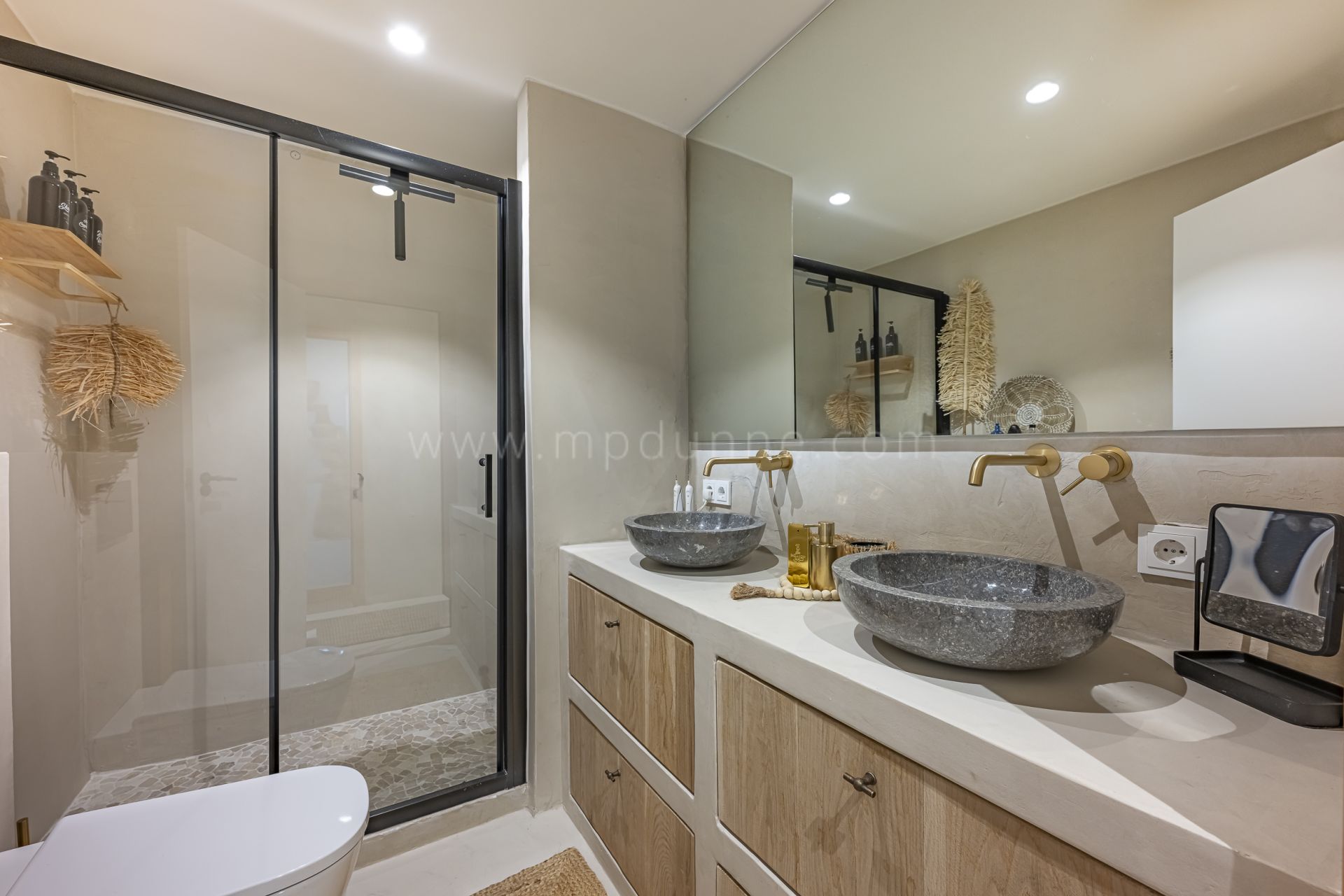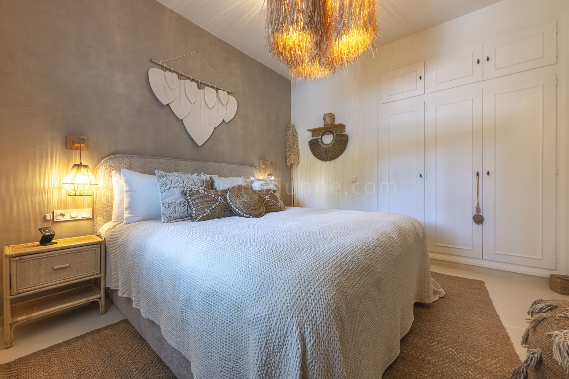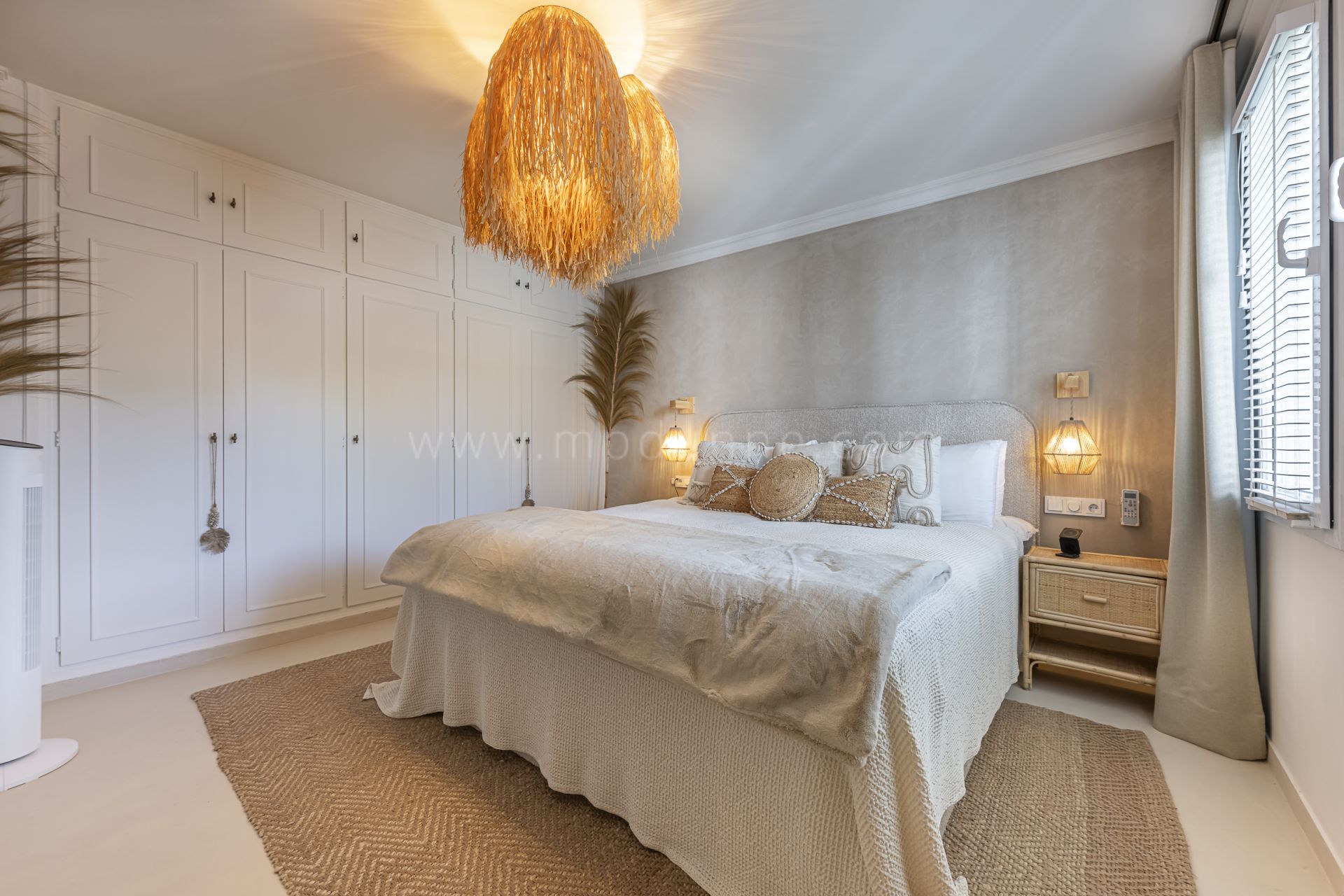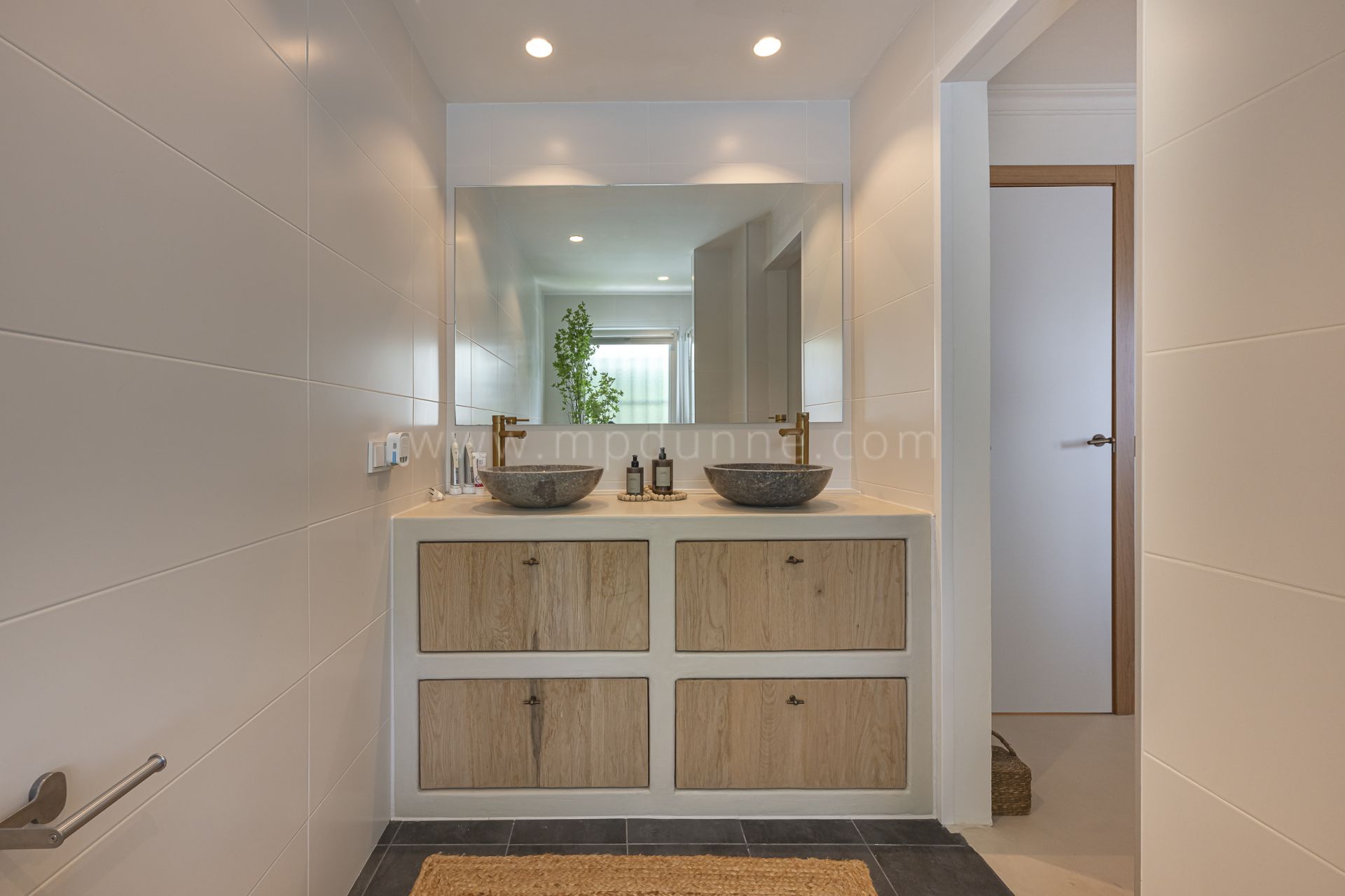 El interior presenta un estilo mediterráneo moderno con sutiles influencias boho, con elementos de madera cálida y superficies elegantes en todo el espacio. La zona de estar y comedor de planta abierta conecta perfectamente con las terrazas exteriores, creando un espacio versátil tanto para el día a día como para el entretenimiento.