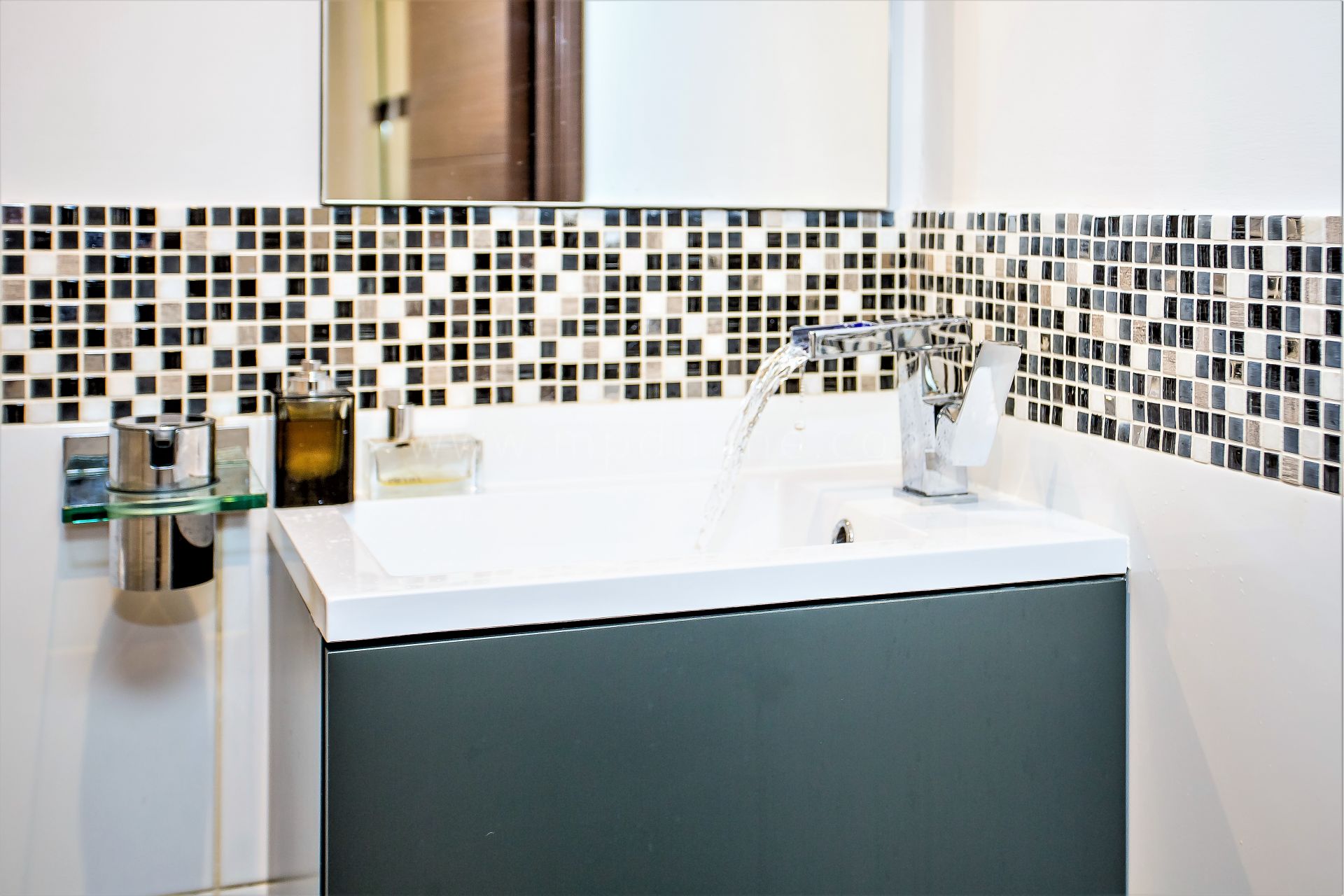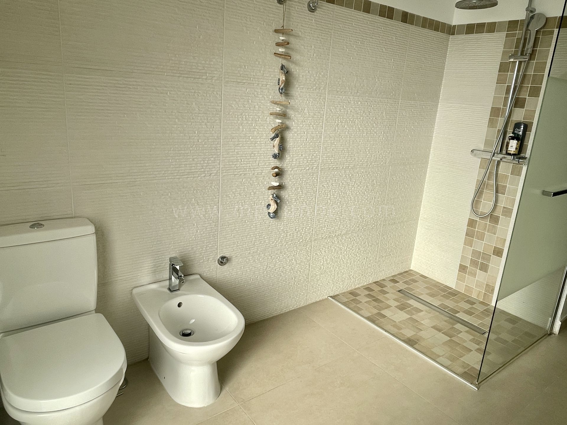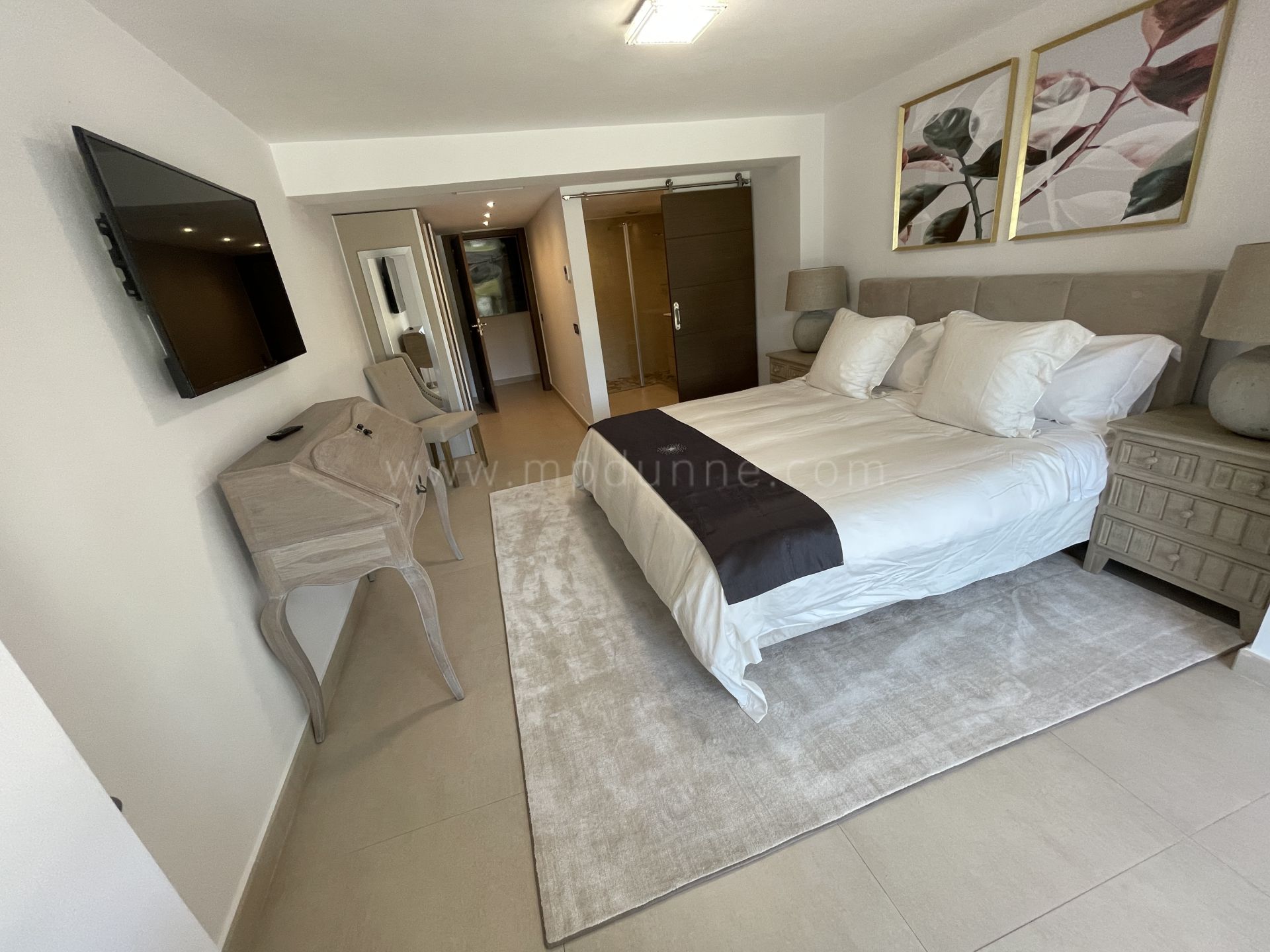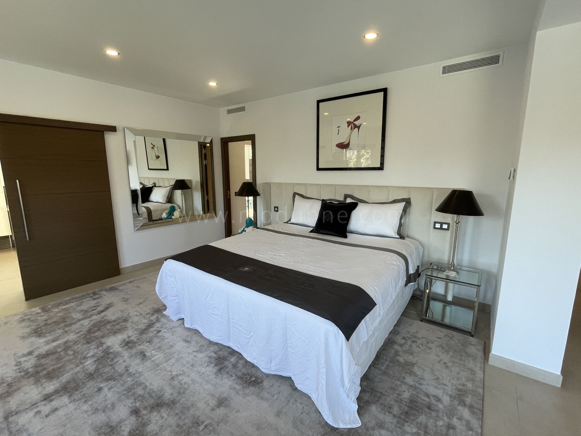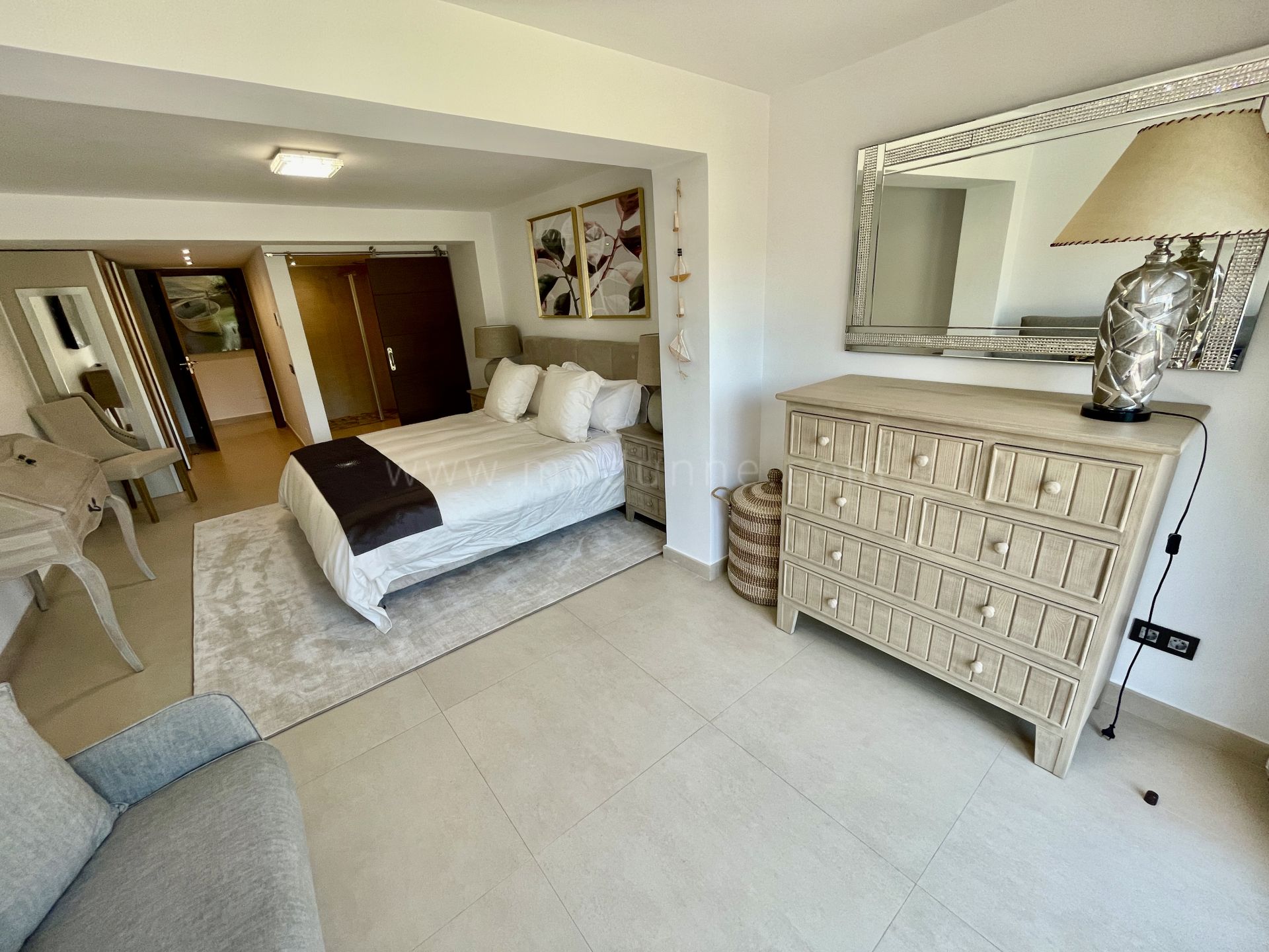La suite principal cuenta con su propio balcón, vestidor y dos baños separados: uno con bañera de hidromasaje y otro con una amplia ducha efecto lluvia y acabados de alta calidad.
