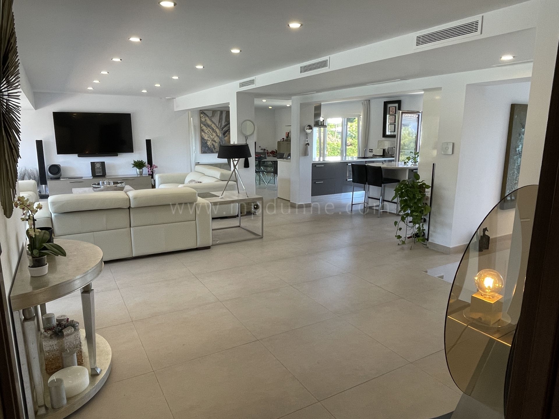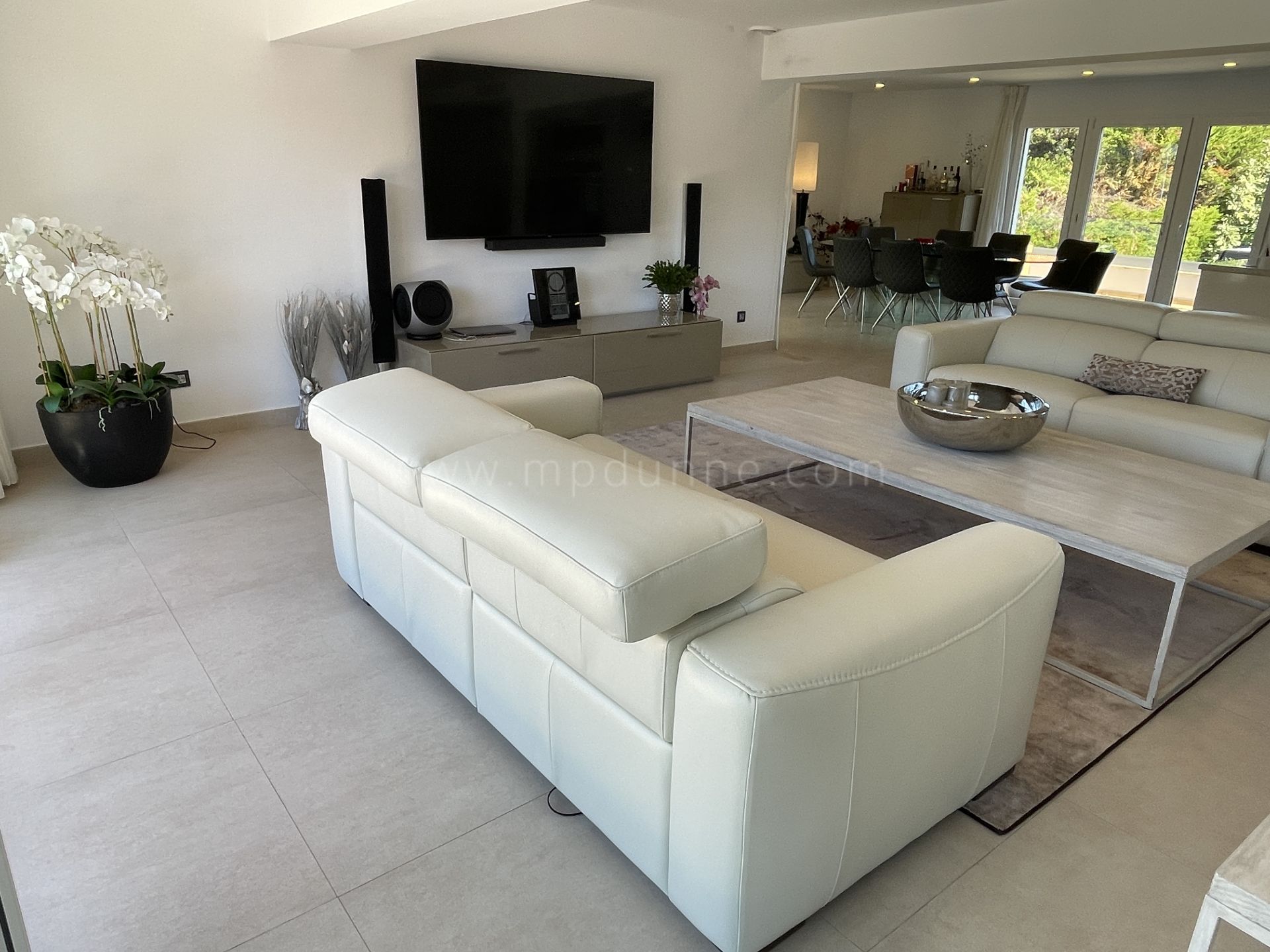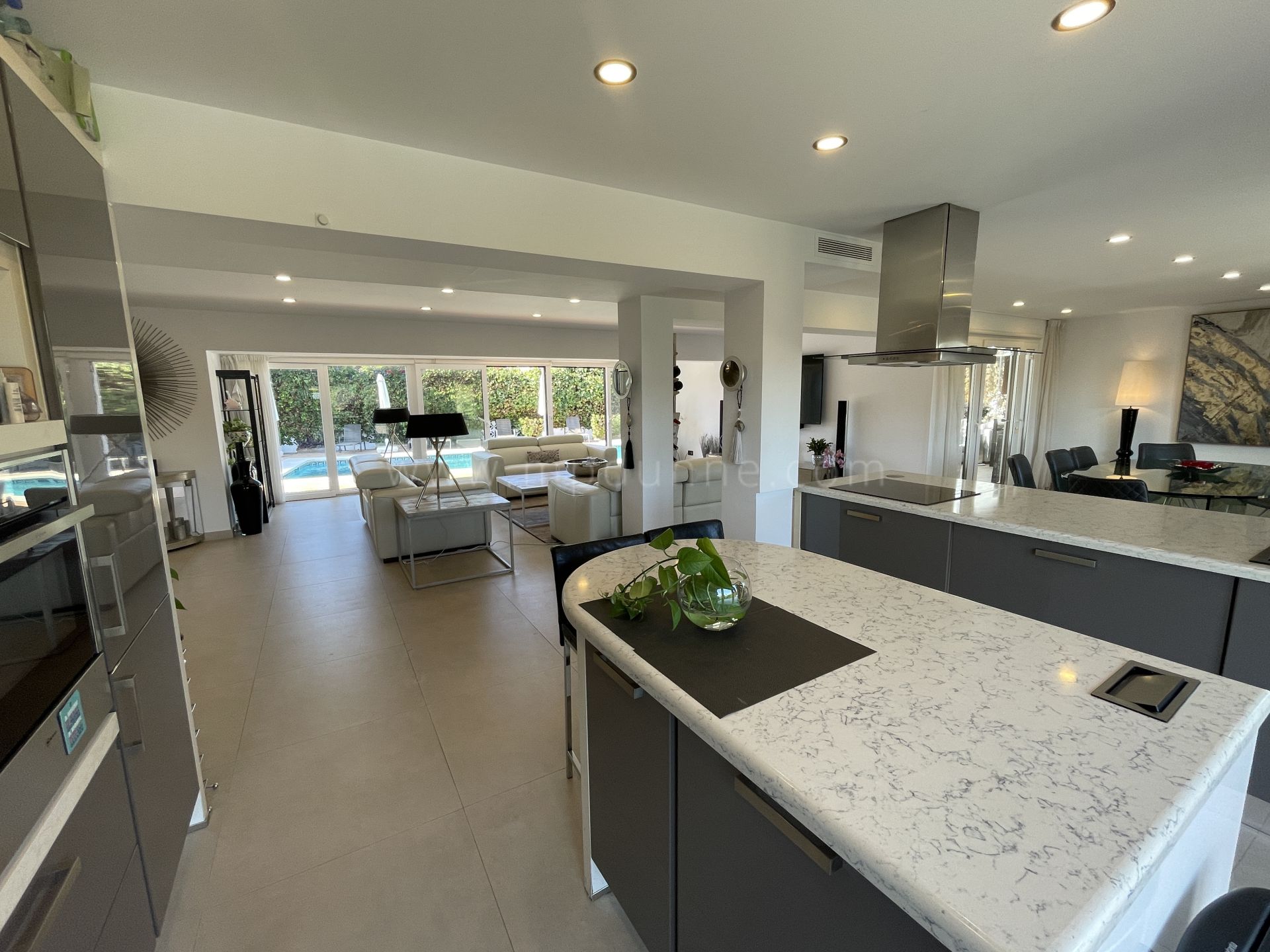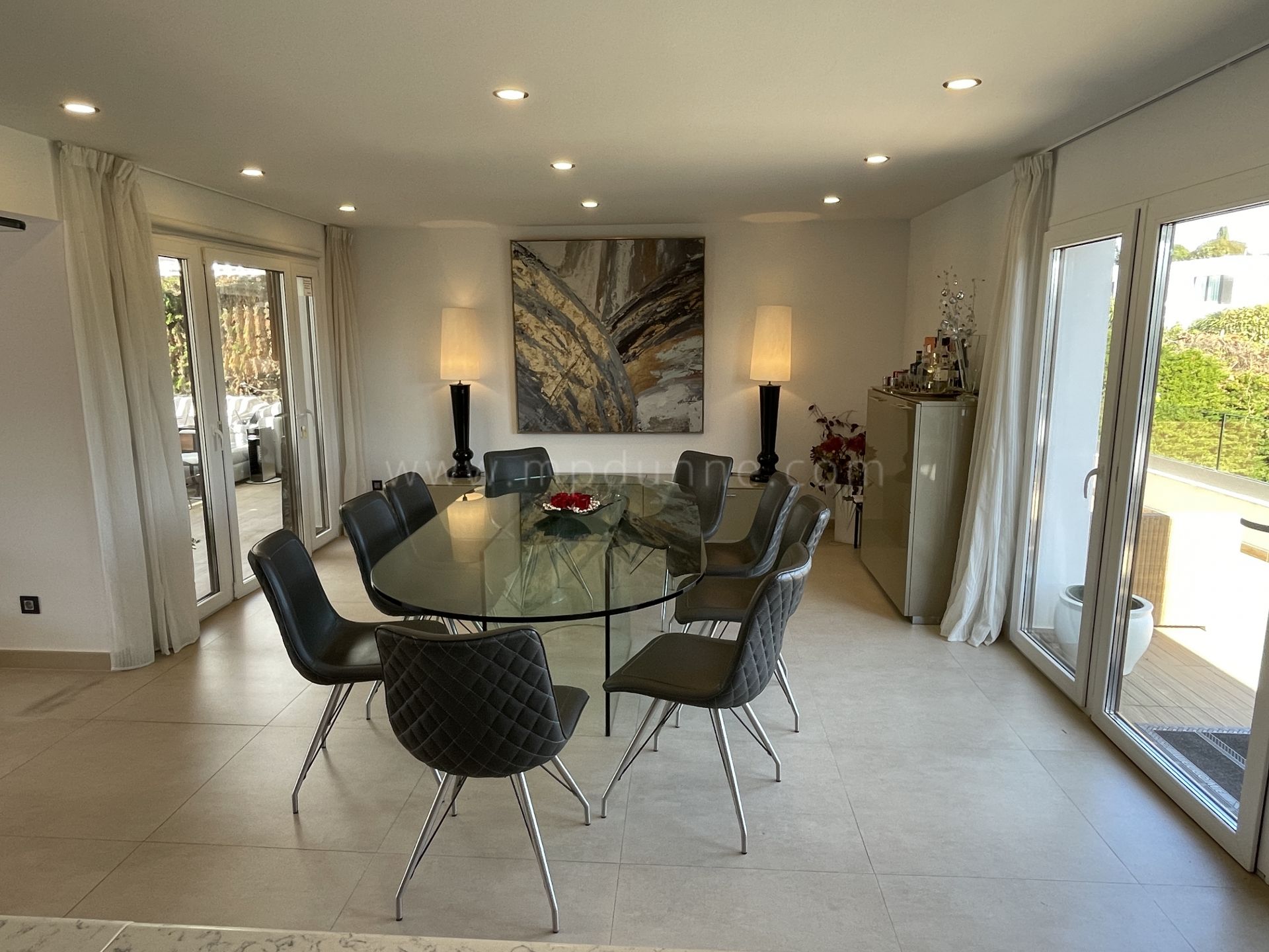 La planta superior dispone de una luminosa zona de estar de planta abierta con acceso a balcones y a la piscina orientada al sur. También hay una segunda cocina de diseño con electrodomésticos Neff y un comedor adicional.
