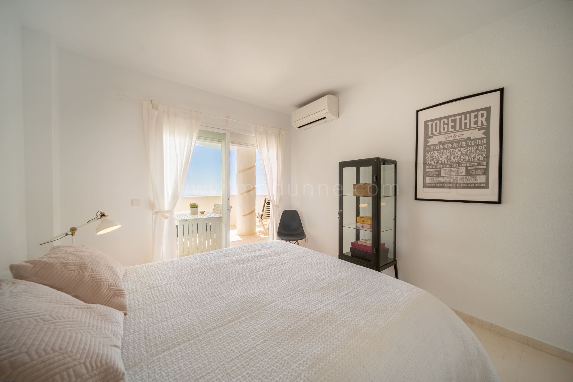 La chambre principale dispose d’un accès direct à la terrasse principale, avec une vue imprenable sur la mer, et de sa propre salle de bains attenante. Les deux chambres sont équipées d’armoires encastrées, et une deuxième salle de bains dans le couloir est à la disposition des invités et de la deuxième chambre.