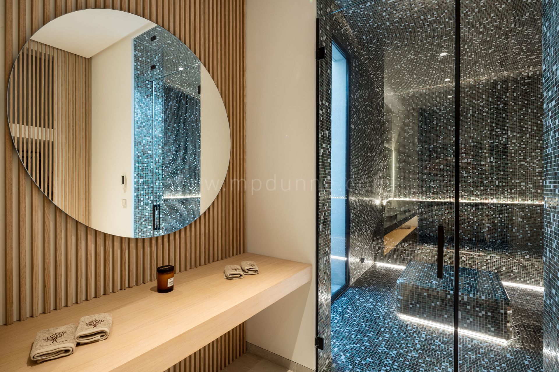 La villa a été pensée pour le confort et les loisirs. Elle comprend une salle de cinéma privée, une cave à vin climatisée, un hammam et un sauna. Chaque détail a été sélectionné pour une vie agréable et pratique.