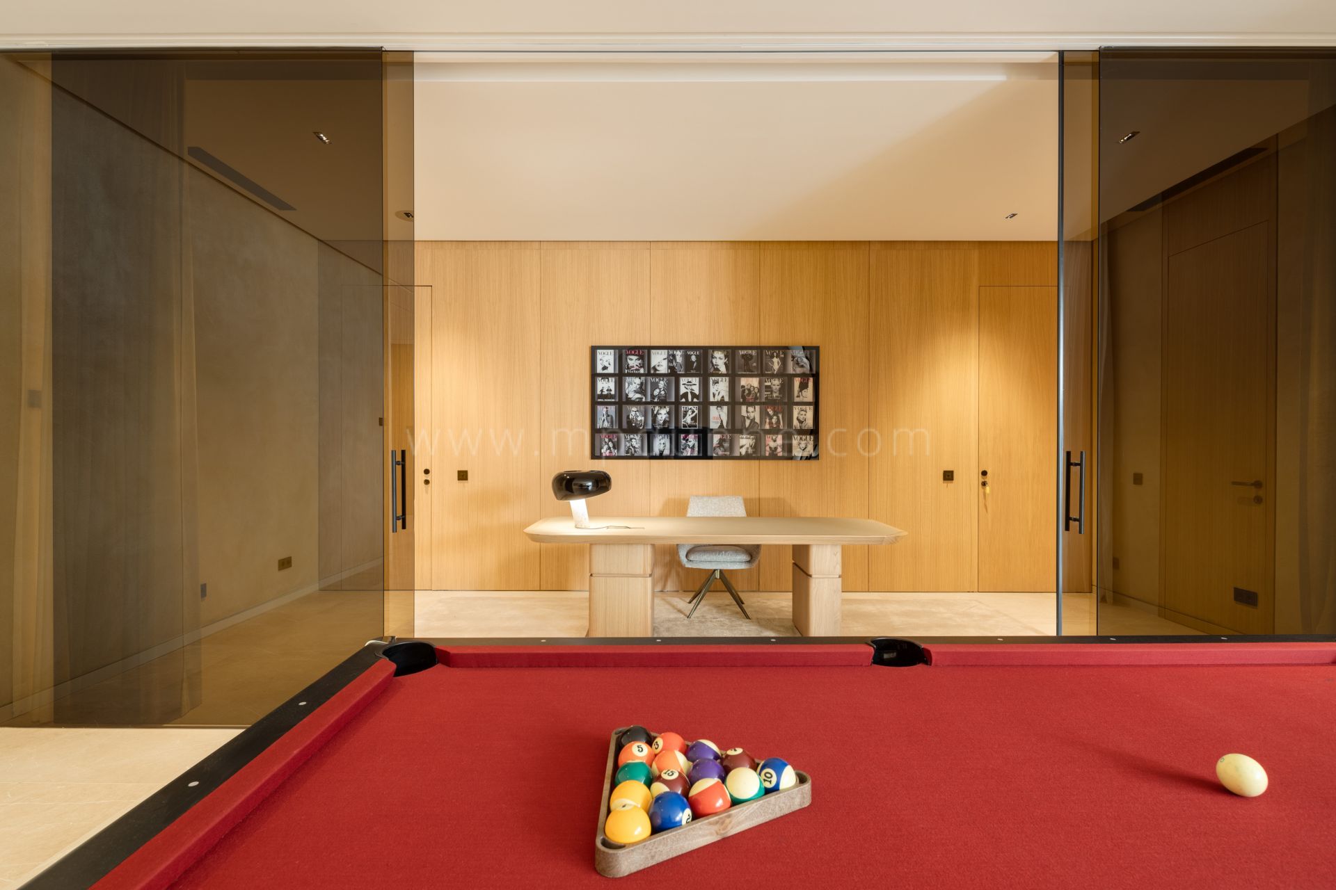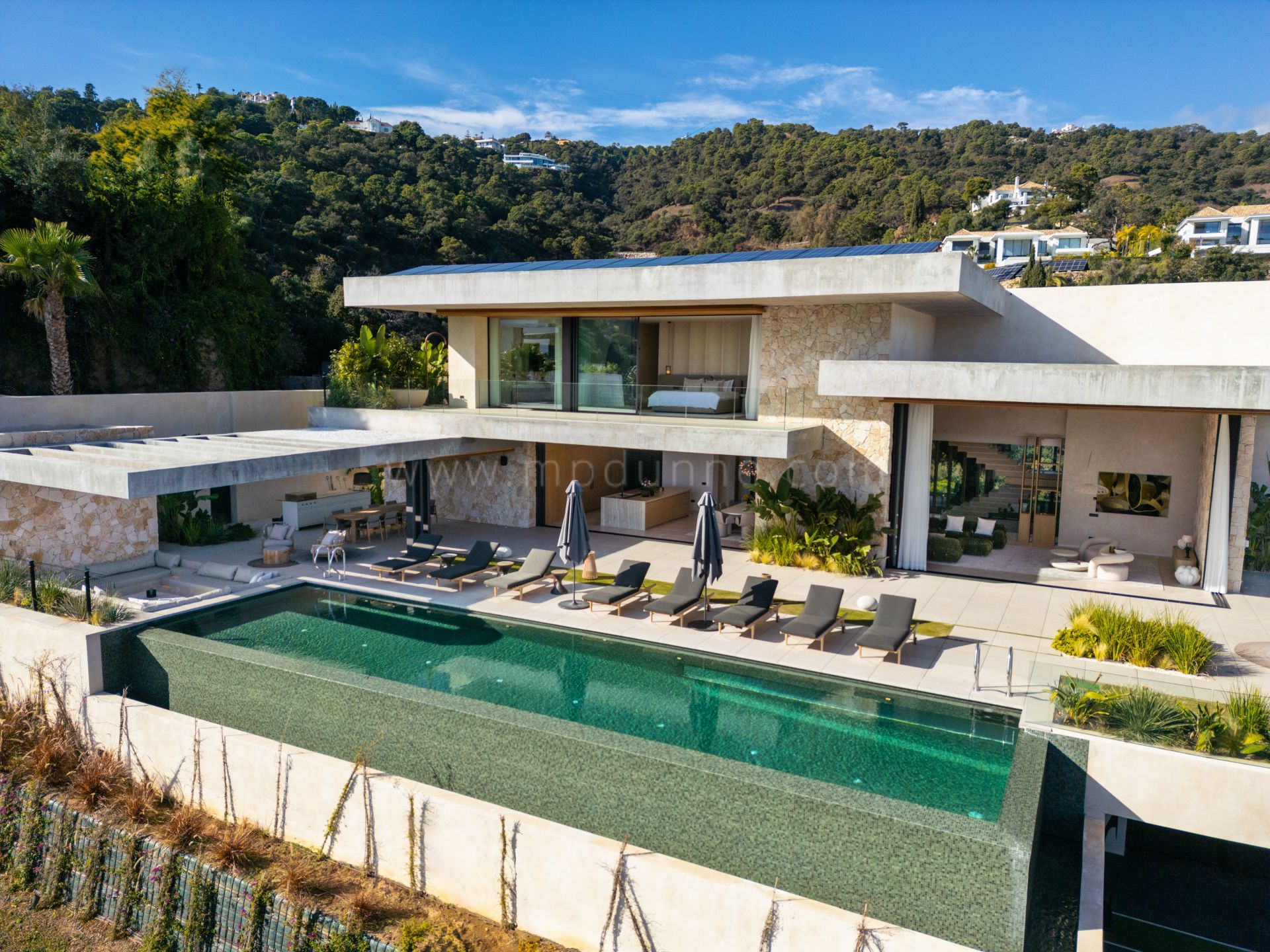 La villa privilégie la lumière et l’espace, avec des salons et salles à manger ouverts qui s’ouvrent sur les terrasses extérieures grâce à des baies vitrées du sol au plafond. Une cheminée centrale structure l’espace principal, tandis que la cuisine moderne, équipée d’une cuisine cachée pour le chef, permet de recevoir avec élégance. Des matériaux raffinés, tels que des sols en bois en chevron et des poignées en cuir, renforcent l’intérieur sophistiqué et accueillant.