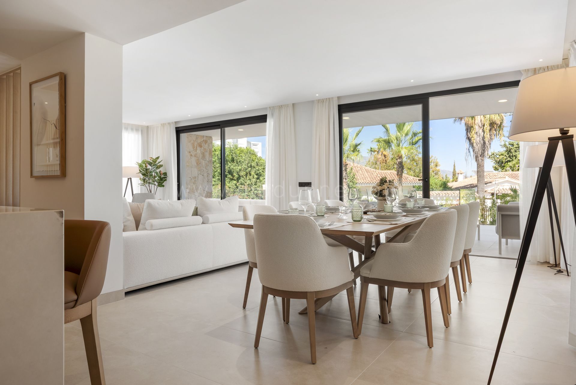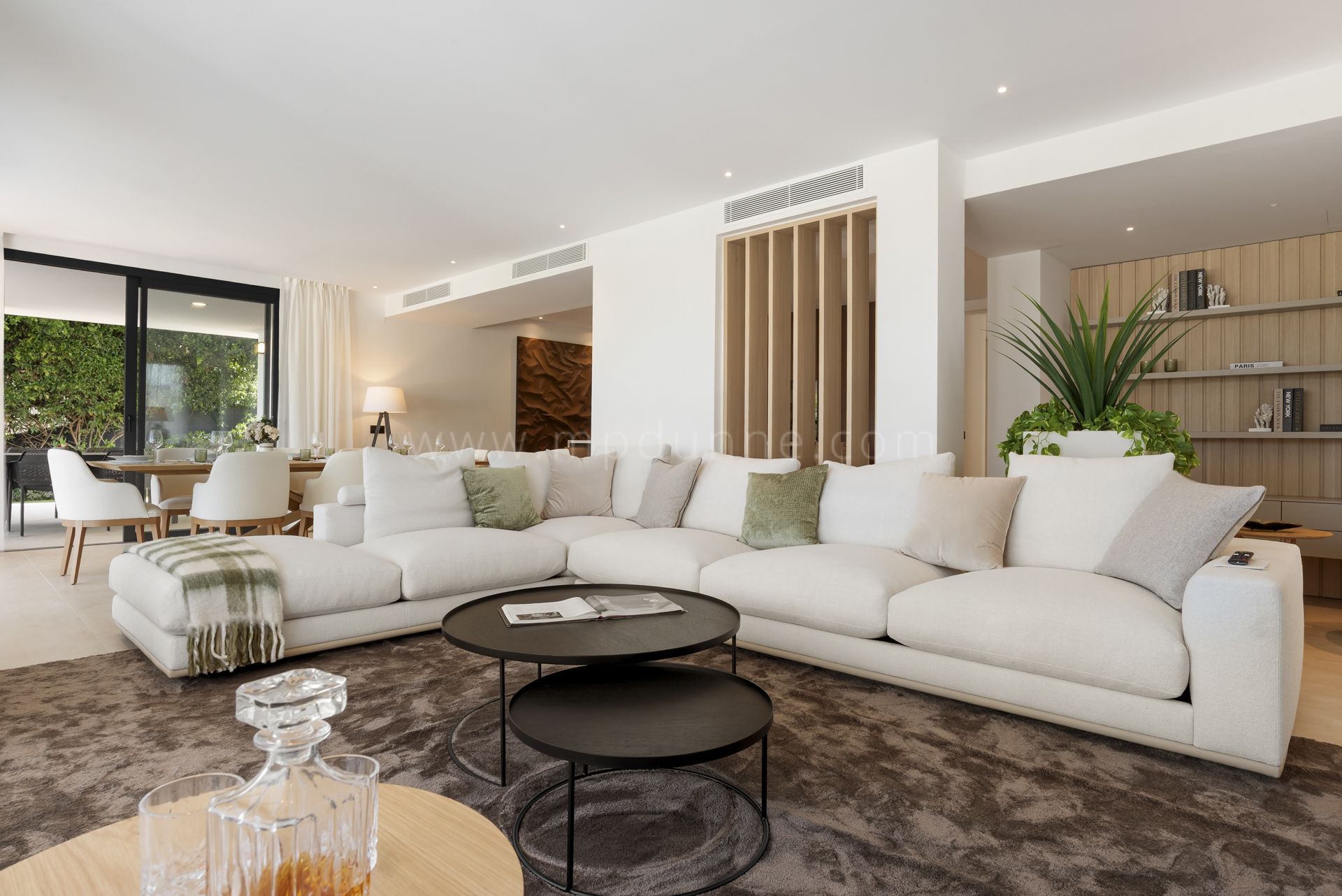 Le niveau principal se compose d’un espace ouvert lumineux, où la cuisine, la salle à manger et le salon s’ouvrent naturellement sur la terrasse et le jardin. La cuisine dispose d’un îlot central et d’une finition élégante, créant un espace social agréable pour la vie quotidienne et les réceptions. Le salon s’ouvre directement sur l’extérieur, où un jardin privé et une piscine s’intègrent dans un aménagement paysager mature.