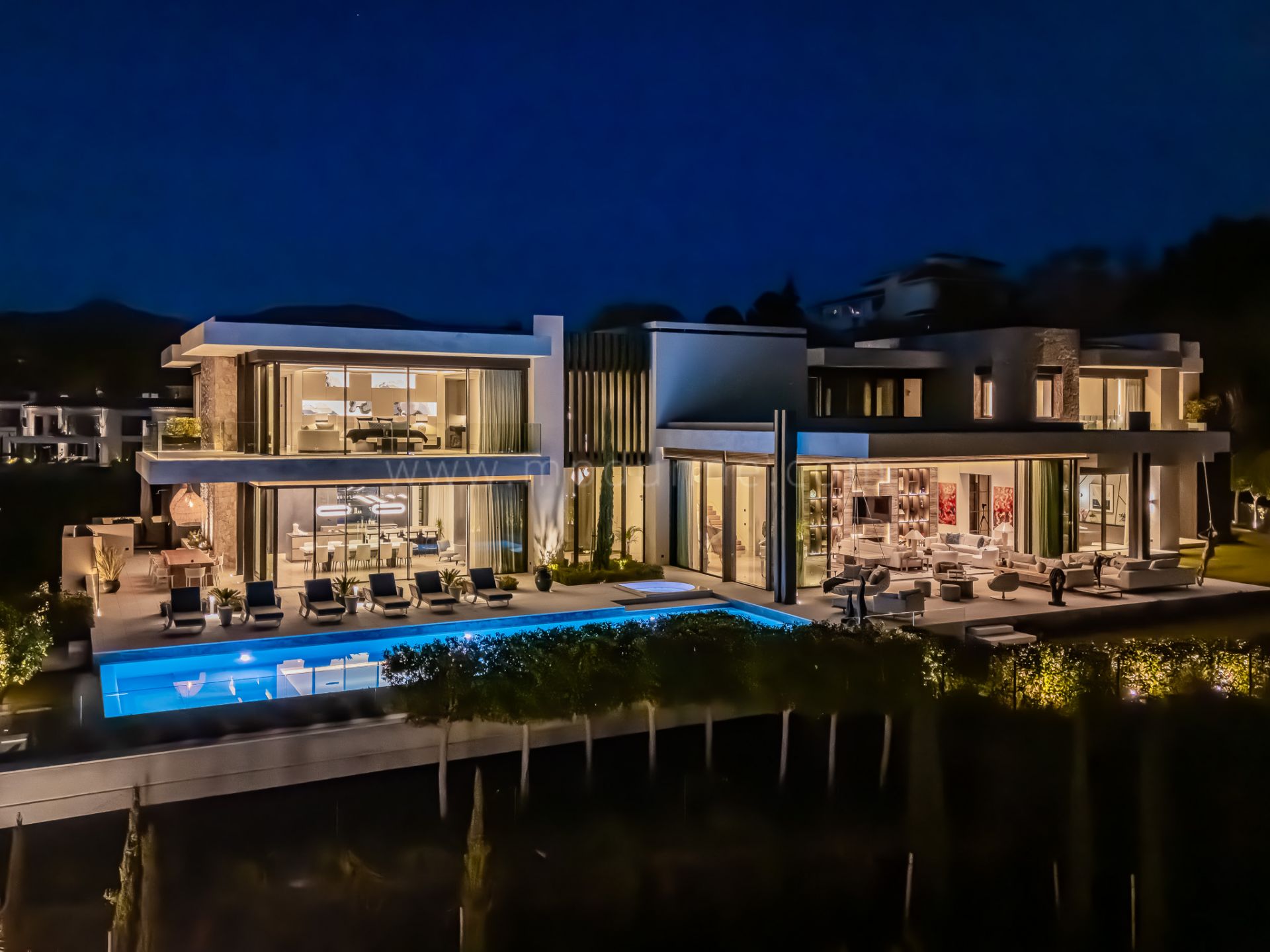 Le niveau inférieur est conçu pour les loisirs, avec des chambres supplémentaires pour les invités, un espace de divertissement avec bar, une piscine intérieure, une salle de sport et un sauna. Un garage privé pour plusieurs voitures complète la propriété, offrant un confort adapté à une utilisation annuelle ou à de longs séjours. La villa combine des lignes architecturales affirmées avec des finitions chaleureuses, créant une maison moderne pensée pour le confort, la discrétion et un mode de vie soigné.
