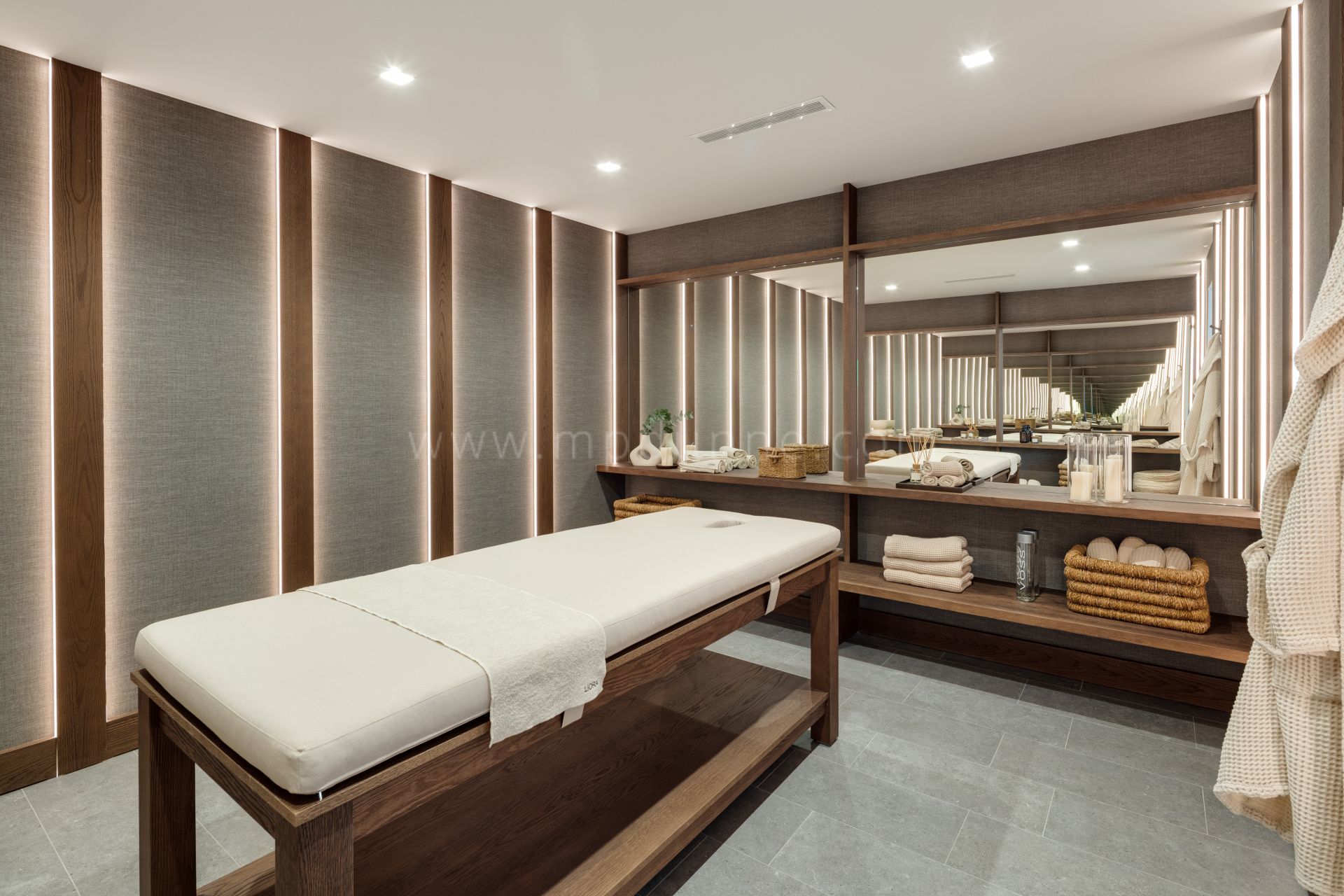 Le rez-de-jardin est consacré aux loisirs, comprenant un cinéma privé, un espace massage, une salle de sport entièrement équipée, une cave à vin et des chambres supplémentaires avec kitchenette. Les installations techniques sont séparées pour minimiser les nuisances. Un système domotique complet Zennio permet de contrôler l’éclairage, le climat et la sécurité.