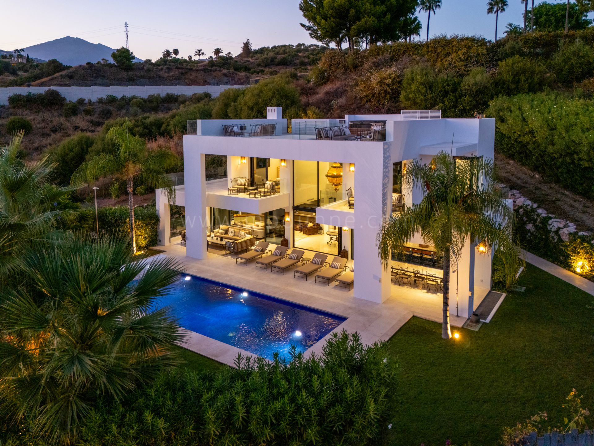 Les principales pièces de réception sont conçues pour la détente et les moments de convivialité, avec plusieurs salons et une salle de divertissement confortable dotée d’un éclairage d’ambiance. Les chambres bénéficient d’un accès aux terrasses, offrant des espaces privés baignés de lumière. Une terrasse sur le toit prolonge les espaces extérieurs et offre des vues panoramiques sur la Golf Valley de Nueva Andalucía, idéale pour recevoir.