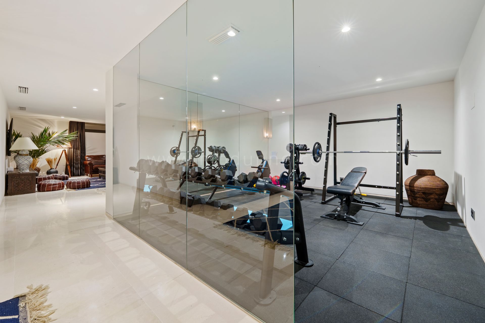 La villa associe une architecture moderne à de subtiles influences andalouses et mauresques, visibles dans les luminaires, tapis et meubles sur mesure présents dans toute la propriété. Les hauts plafonds, les matériaux naturels tels que la pierre et le bois, ainsi que la végétation intérieure apportent chaleur et caractère, tandis qu’une palette neutre et un éclairage doux renforcent l’ambiance.