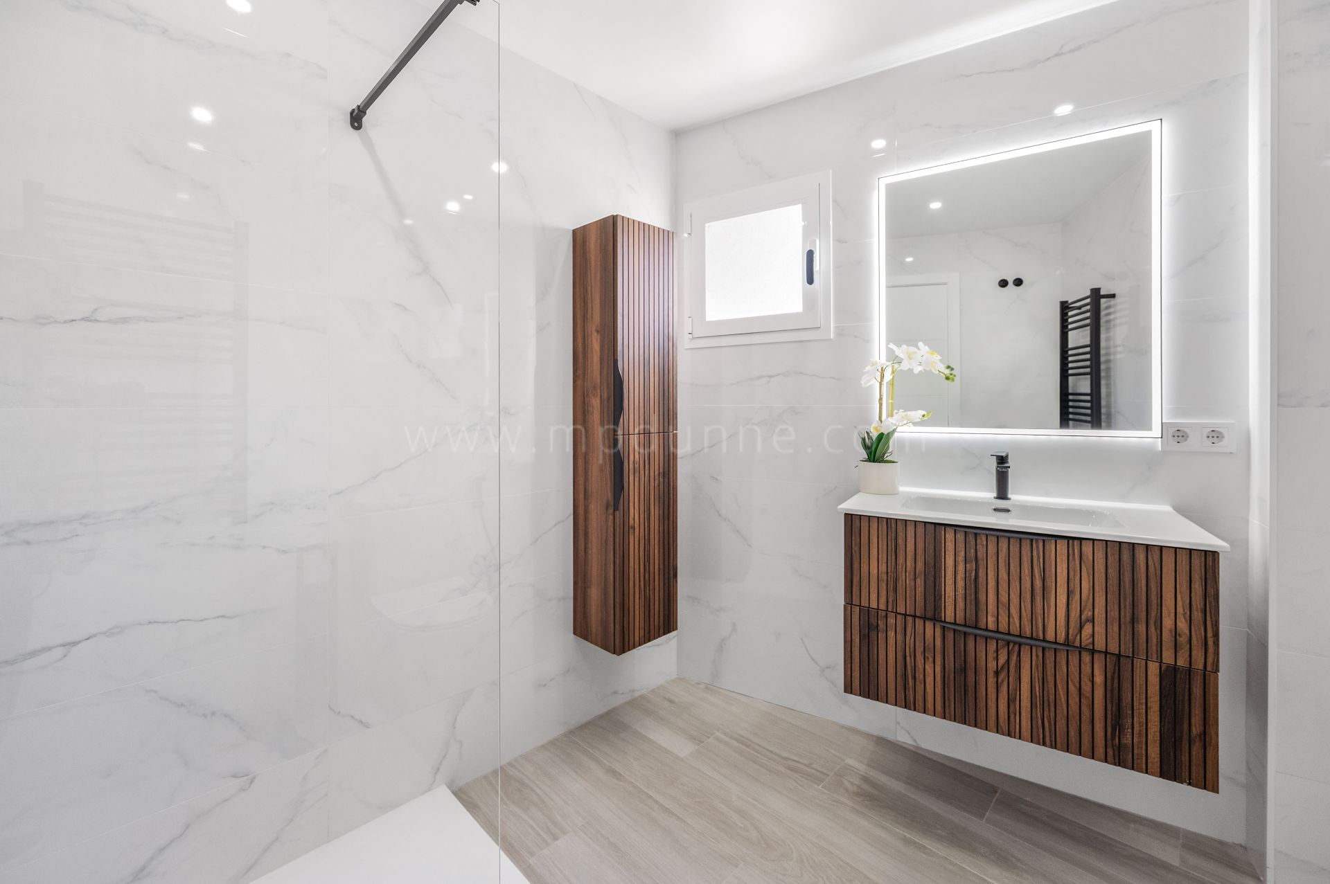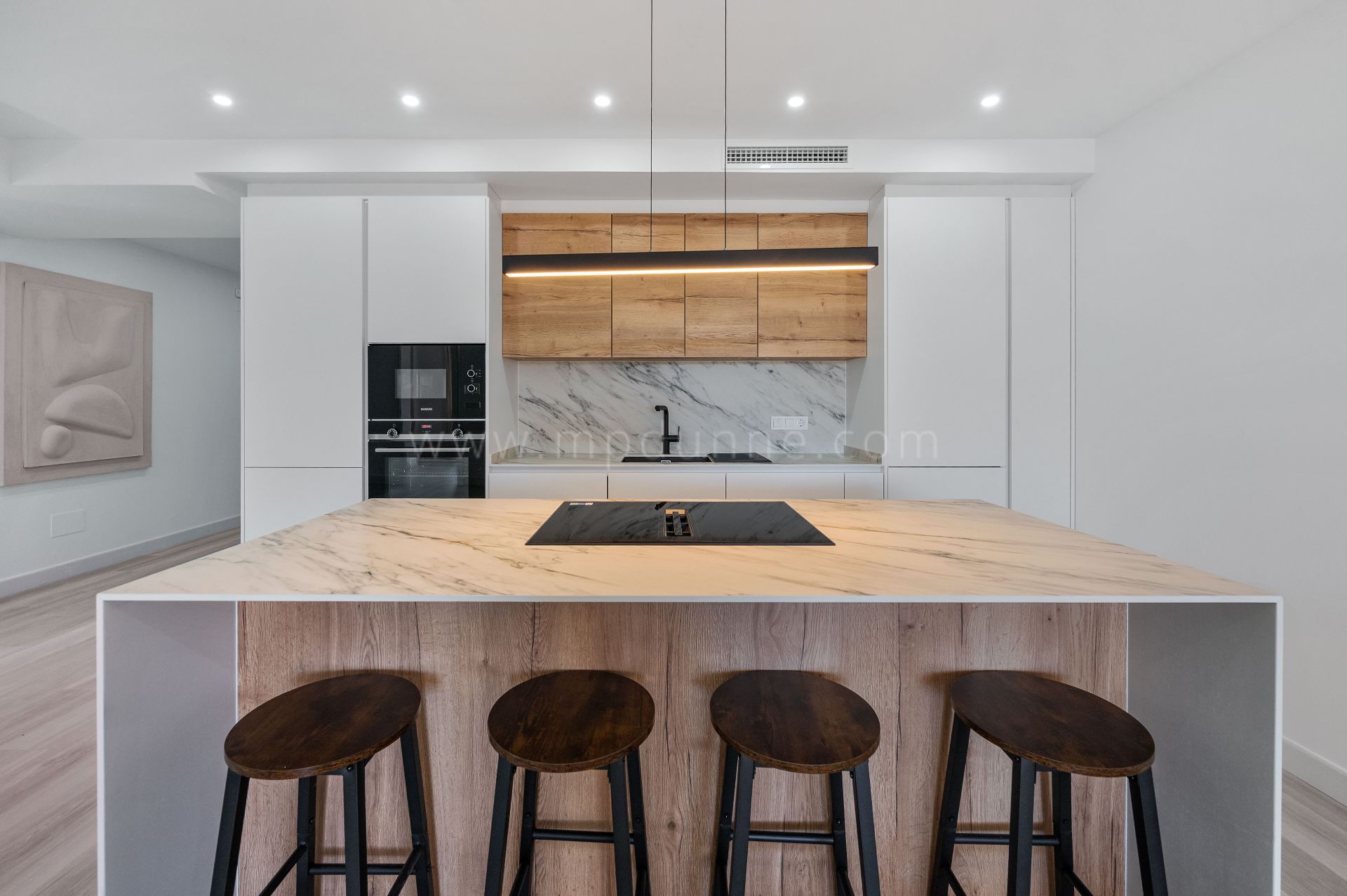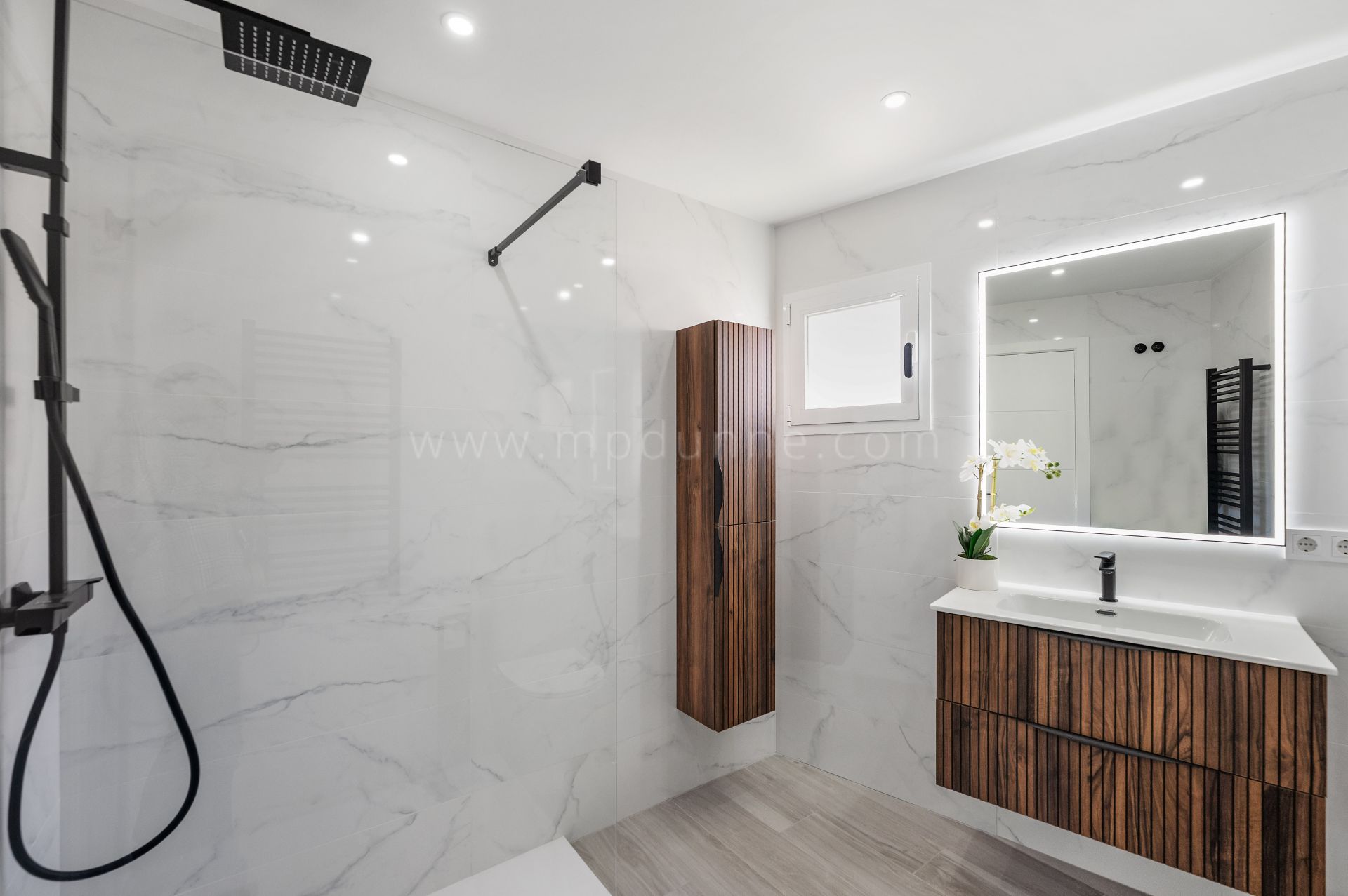 Le hall d’entrée mène à une cuisine rénovée au style épuré et contemporain. Une chambre bien proportionnée se trouve à proximité, tandis que la suite principale dispose de sa propre salle de bain et d’un accès direct à la terrasse.