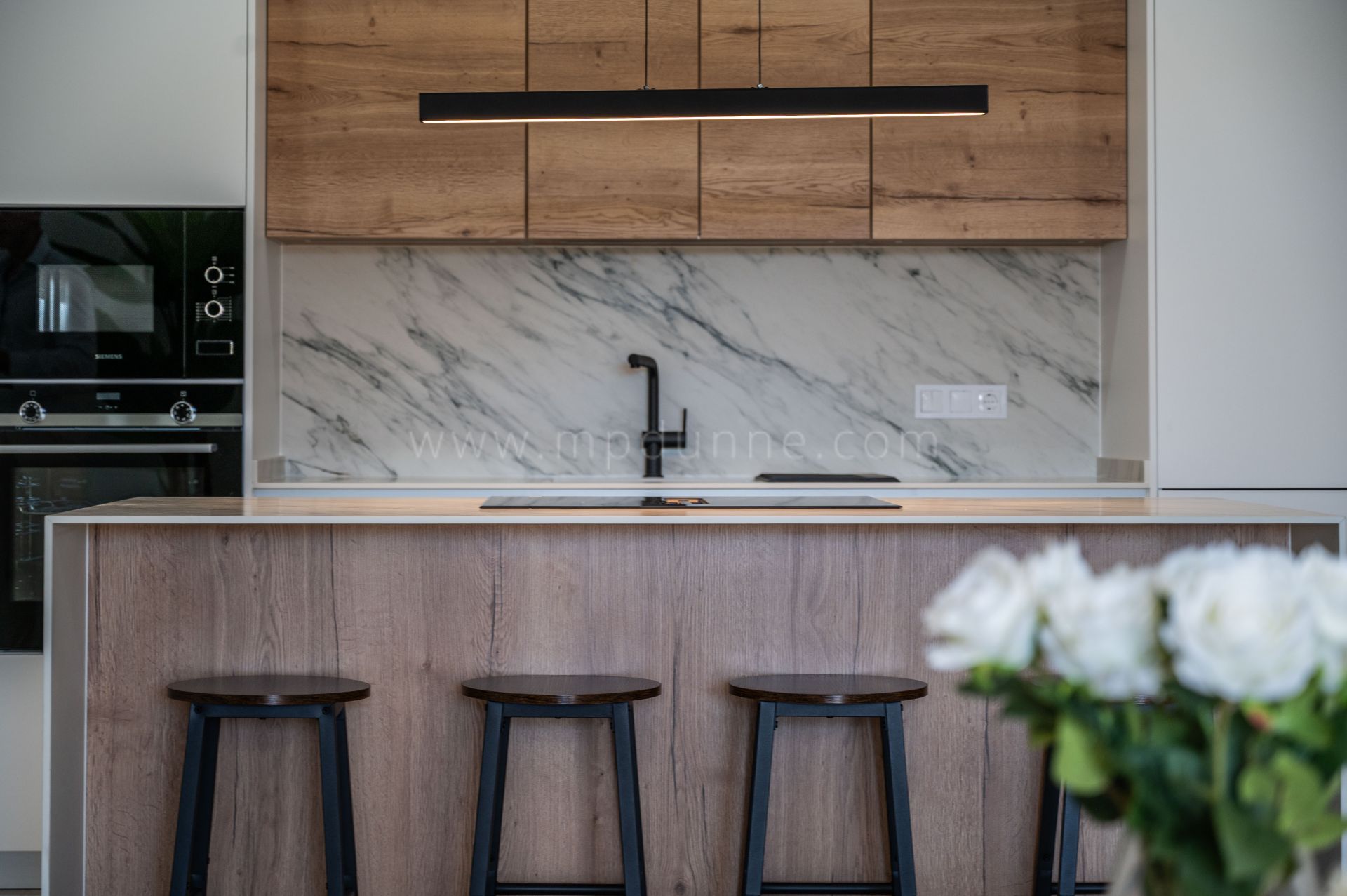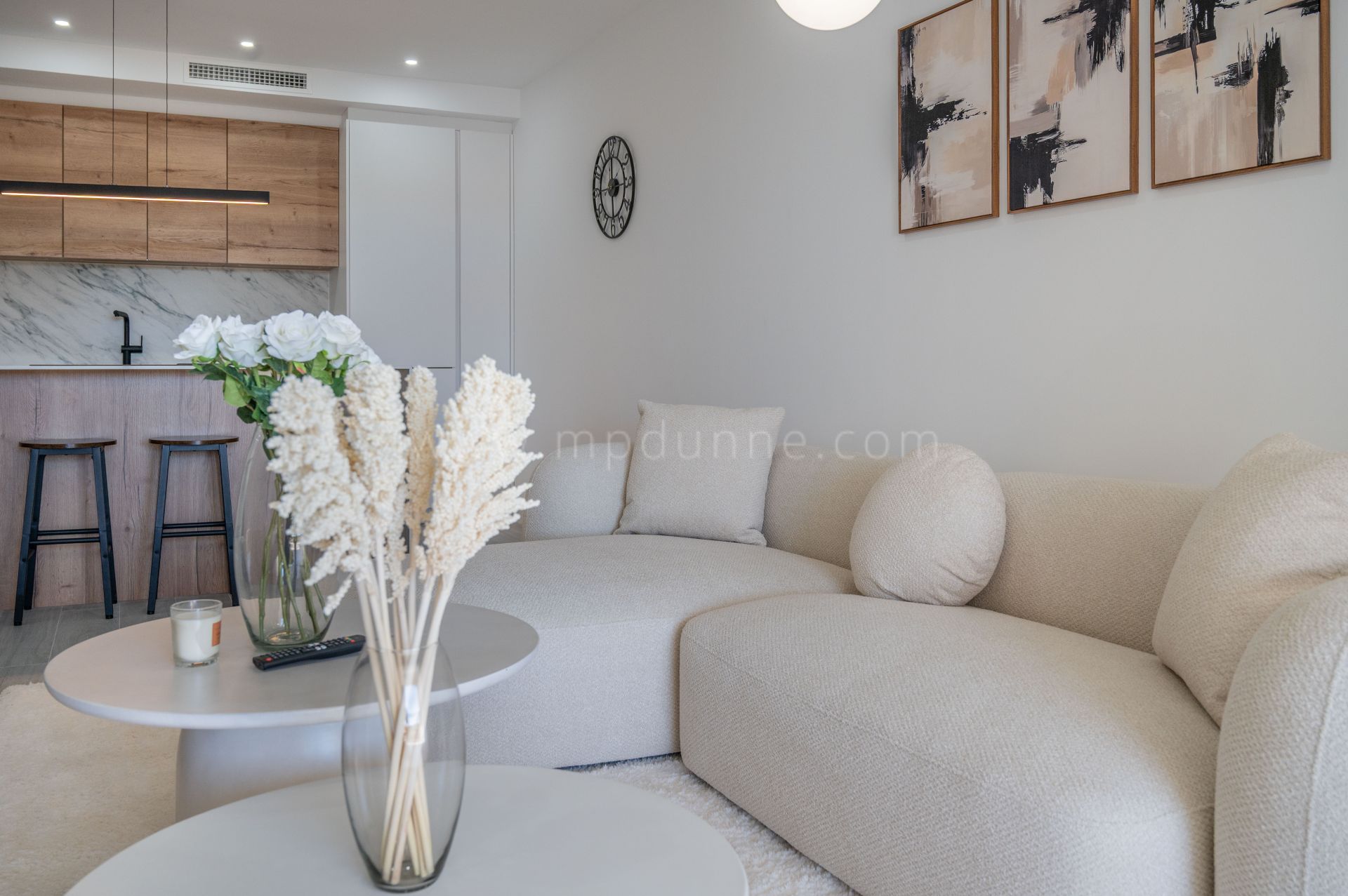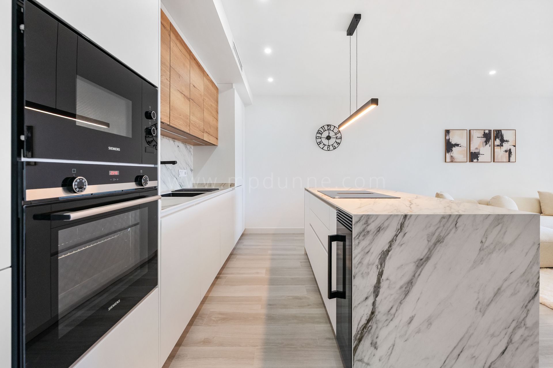 Le hall d’entrée mène à une cuisine rénovée au style épuré et contemporain. Une chambre bien proportionnée se trouve à proximité, tandis que la suite principale dispose de sa propre salle de bain et d’un accès direct à la terrasse.