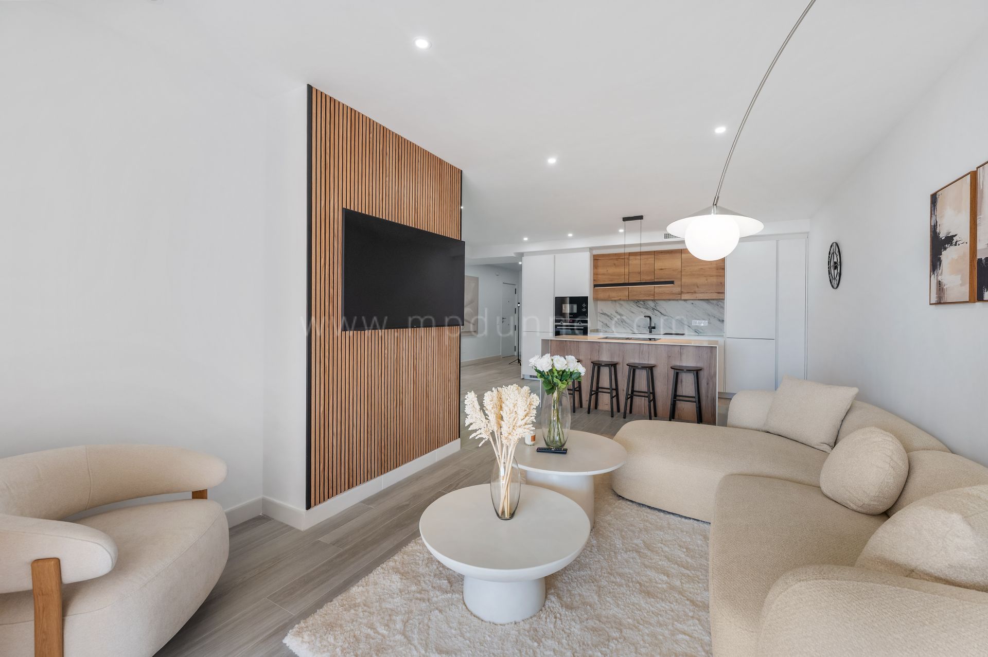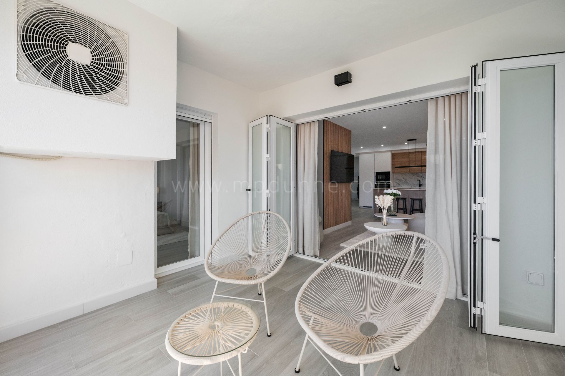 Le salon et la salle à manger bénéficient d’un agencement lumineux et confortable, avec de grandes baies vitrées ouvrant sur une terrasse privée. Depuis cet espace, les vues s’étendent sur la résidence et les environs, avec la montagne de La Concha en arrière-plan.